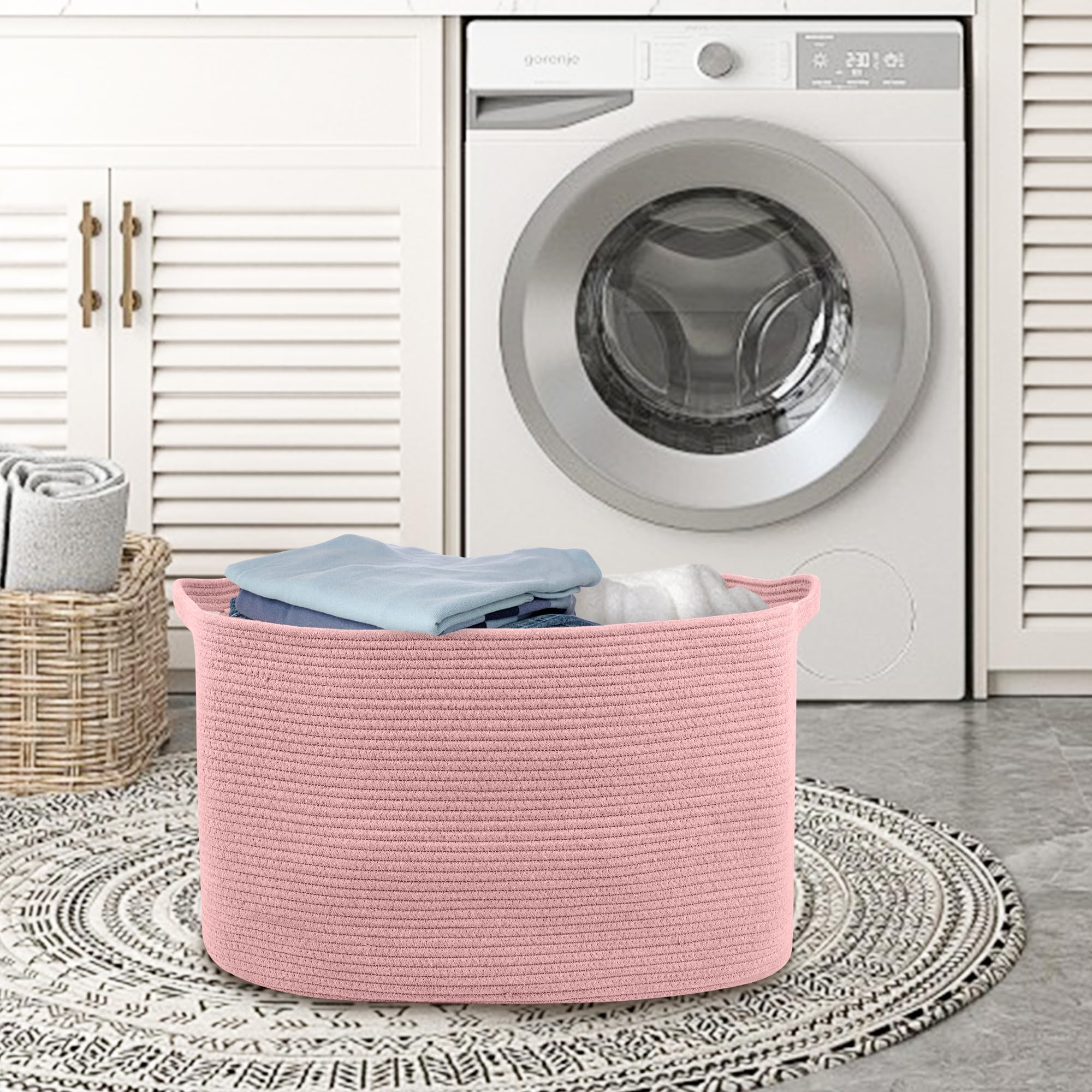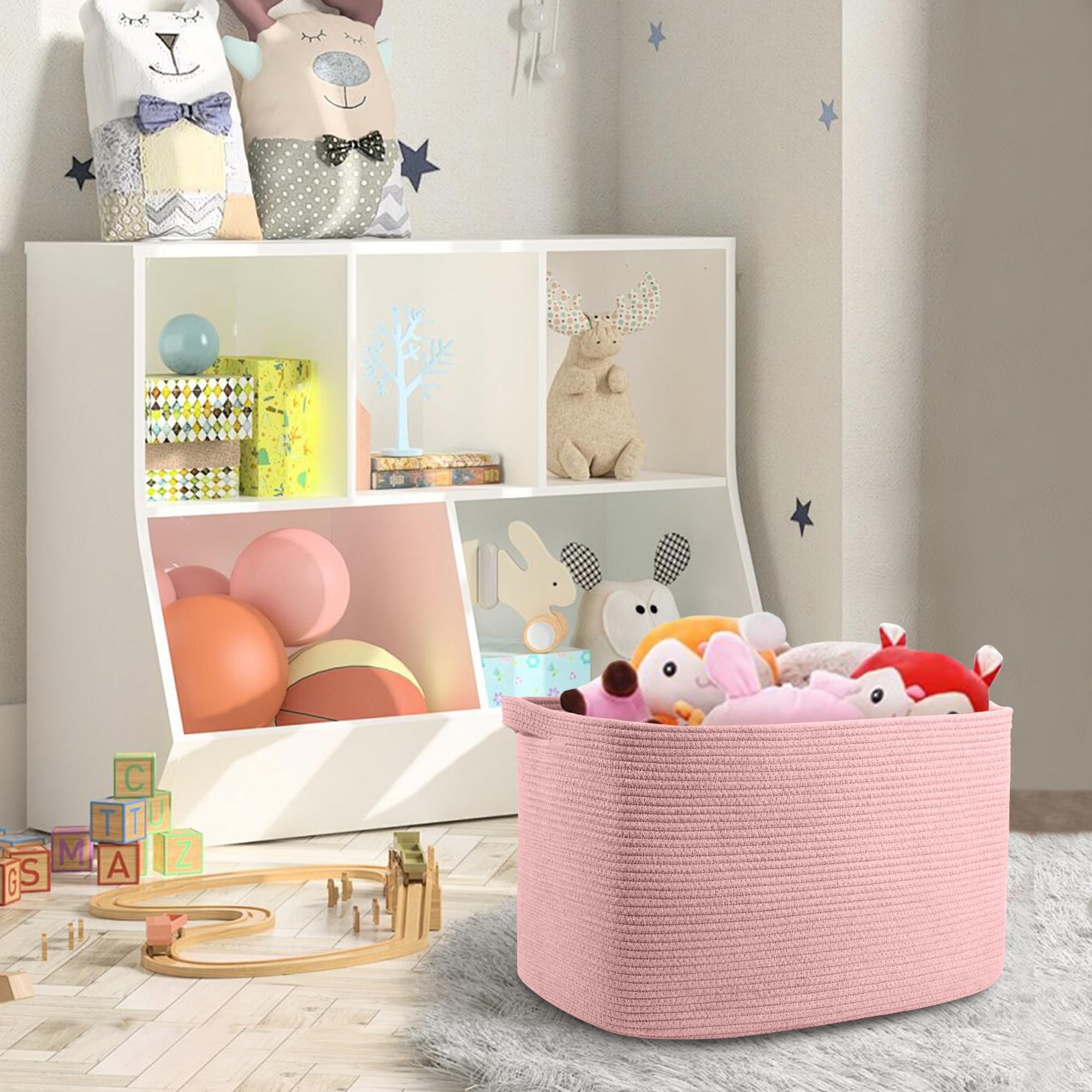 WASHABLE STORAGE CONTAINER: Hand or machine washable. Pink basket for deocr with two built-in handles is easy to moving toys, ,throws, blankets, pillows, sheets from room to room. Large open top is roomy and easy for kids to reach in and get toys which they want to play with. Making the toys more organized and stay where they should be. A gift baskets for family and friends.
