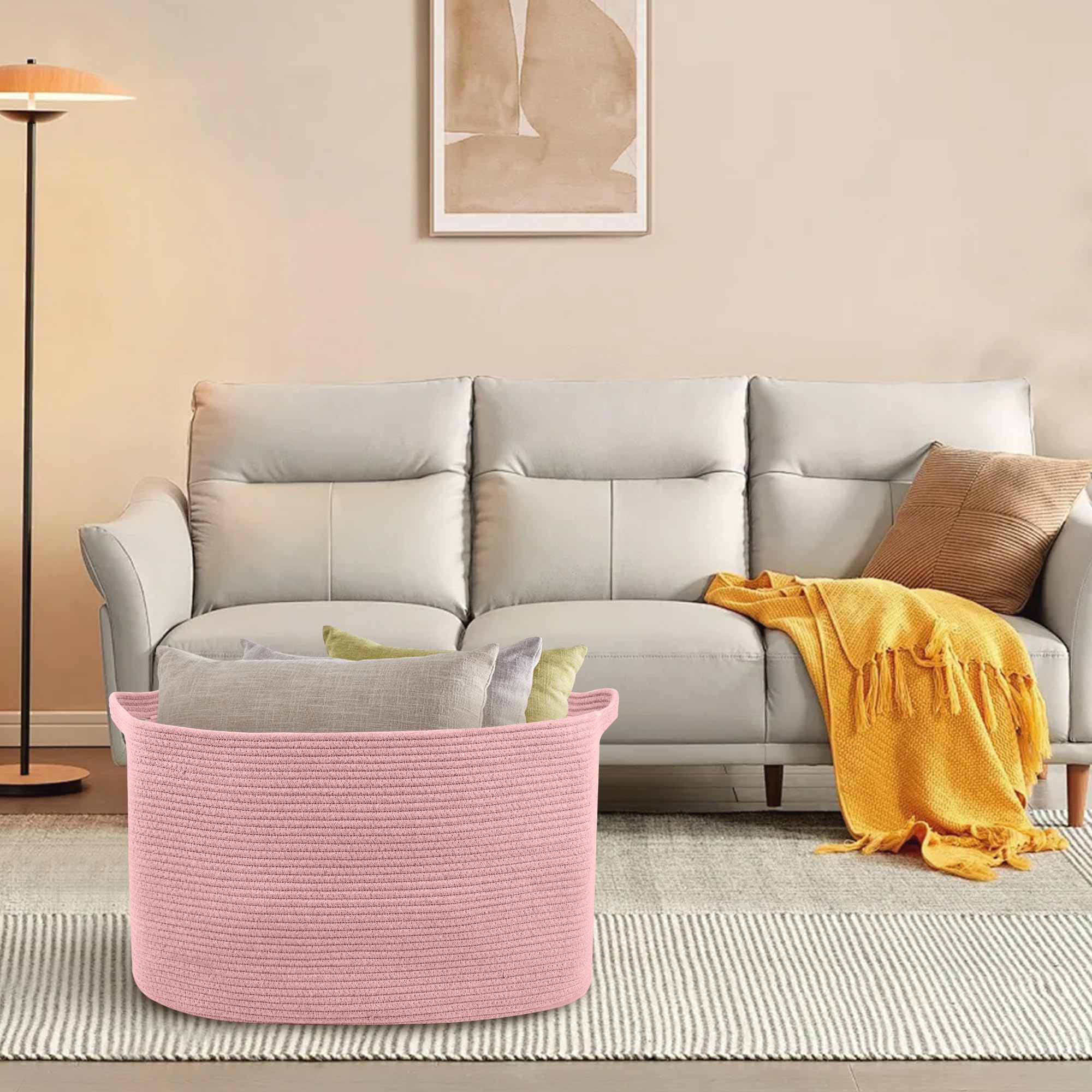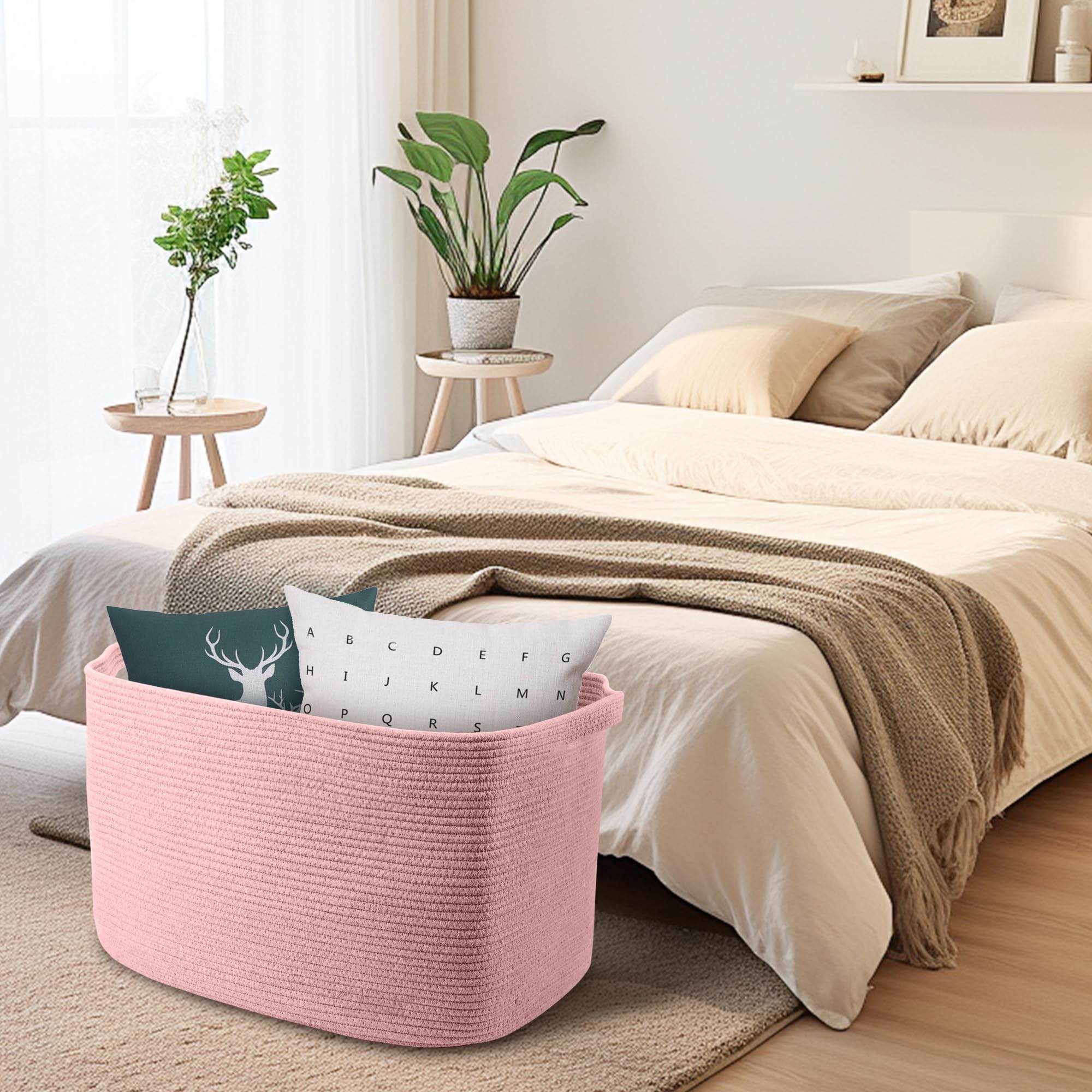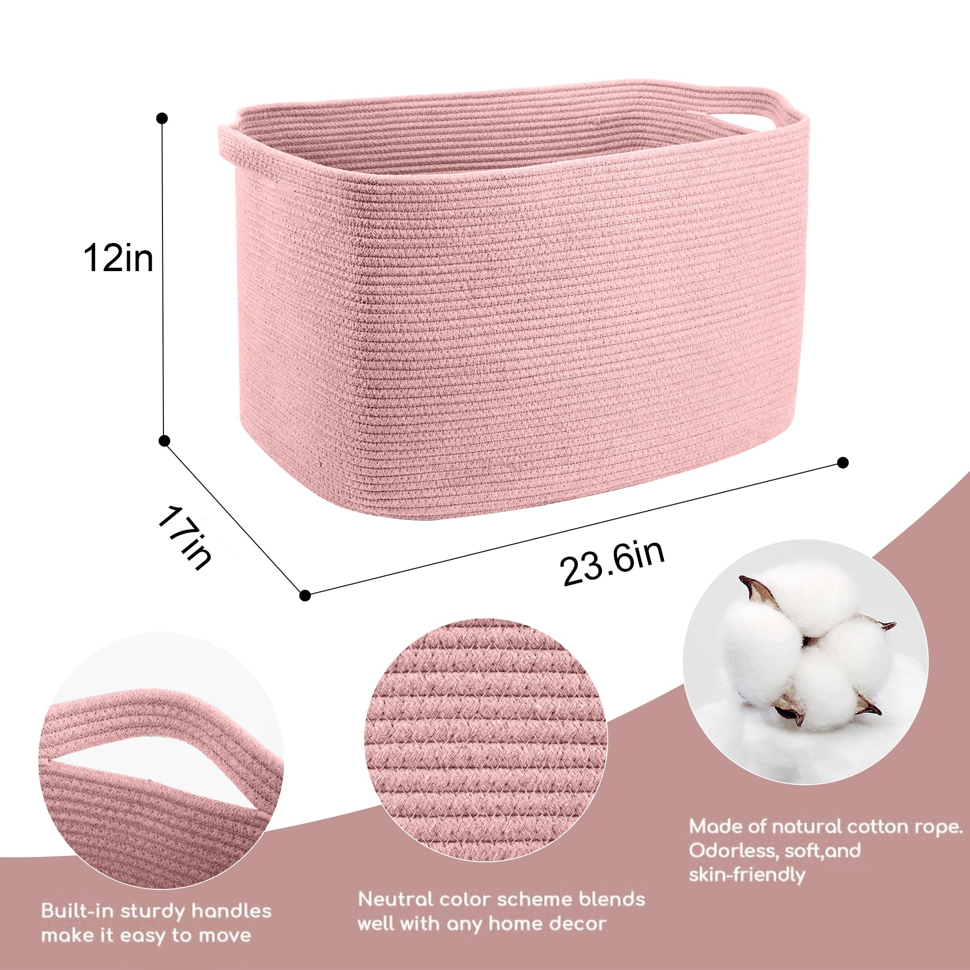 MULTI-FUNCTIONAL BASKETS FOR ORGANIZING: The decorative baskets with pink neutral color scheme blends with your room decor perfectly. Due to its neutral color looking, it can be used to store your extra throw blankets in living room, pillows and comforters in bedroom, Kids stuffed animals toys in kids room, towels in bathroom, baby product in nursery and clothes in laundry room. It doubles not only as a rope storage bin, but also as an additional decoration to any room.
