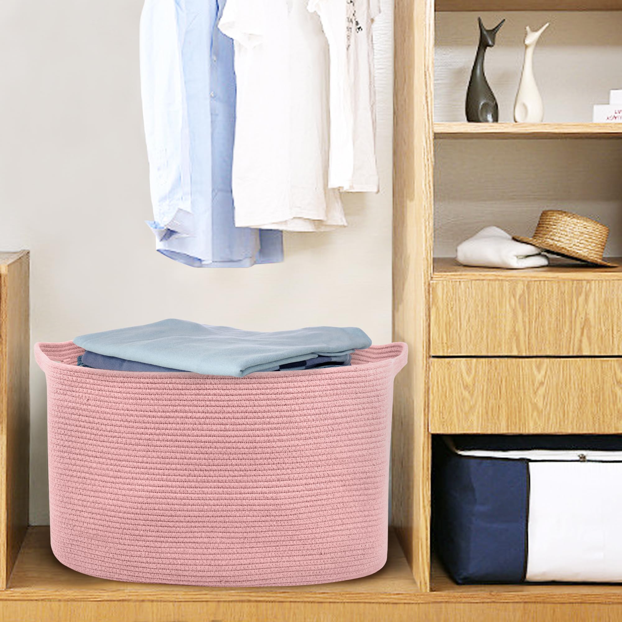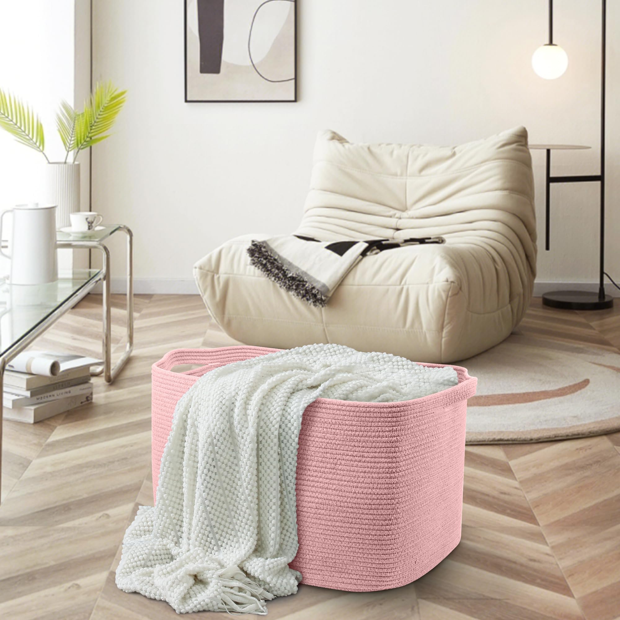 UNIQUE RECTANGLE DESIGN: Unlike usual cotton rope basket, This is a rectangular pink storage basket. The special structure enables this pink bin not only can be placed on the floor, but also fitted on a shelf for shoes and closet for laundry. A giant wicker basket for shelves and closet.
