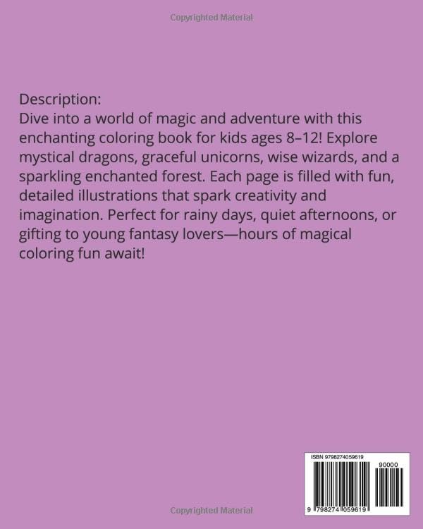 Description: Dive into a world of magic and adventure with this enchanting coloring book for kids ages 8–12! Explore mystical dragons, graceful unicorns, wise wizards, and a sparkling enchanted forest. Each page is filled with fun, detailed illustrations that spark creativity and imagination. Perfect for rainy days, quiet afternoons, or gifting to young fantasy lovers—hours of magical coloring fun await!