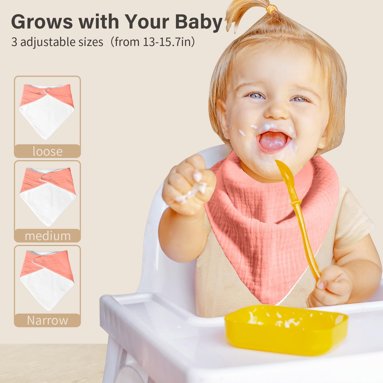 【Adjustable Toddler Bibs】: With the considerate inclusion of 2 nickel-free snaps,our cotton baby bib can be effortlessly adjusted from 13-15.5inch, providing a comfortable fit for your baby's neck. These muslin bibs will beautifully suit newborns and babies up to 36 months.