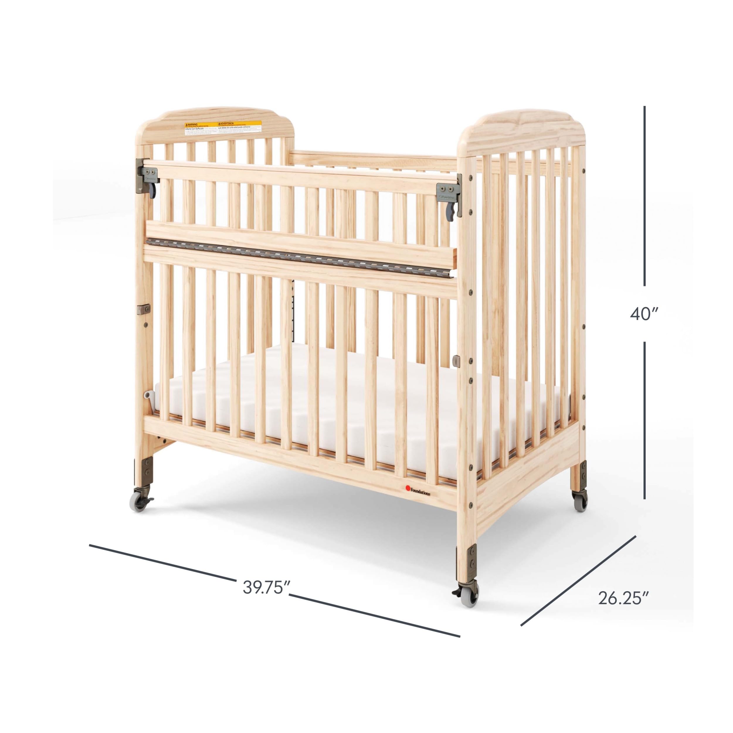 The Foundations SafeReach Commercial Daycare Crib offers exceptional safety, durability, and ergonomic design for professional childcare environments. With four fully slatted sides, it promotes optimal airflow and visibility, allowing caregivers to monitor infants easily from any angle. The patented access gate provides smooth one-handed operation and reduces bending or lifting strain, ideal for high-use daycare centers, hotels, and hospital nurseries. A 3inch foam crib mattress and two adjustable mattress positions accommodate growing infants, while the SafeSupport steel mattress frame and solid wood construction ensure long-lasting strength and stability. Heavy-duty locking non-marking casters allow smooth movement and secure placement on any floor surface. For added versatility, this daycare crib converts to an evacuation crib when paired with the optional Foundations evacuation kit (1962079). Designed and tested to meet commercial childcare safety standards, the SafeReach crib combines reliability, durability, and timeless style, making it a trusted choice for daycares, hotels, and healthcare facilities.