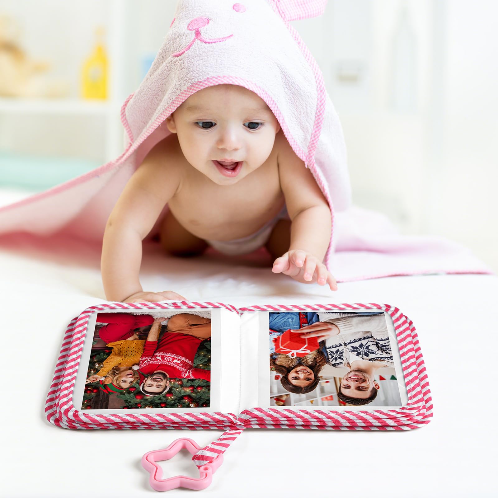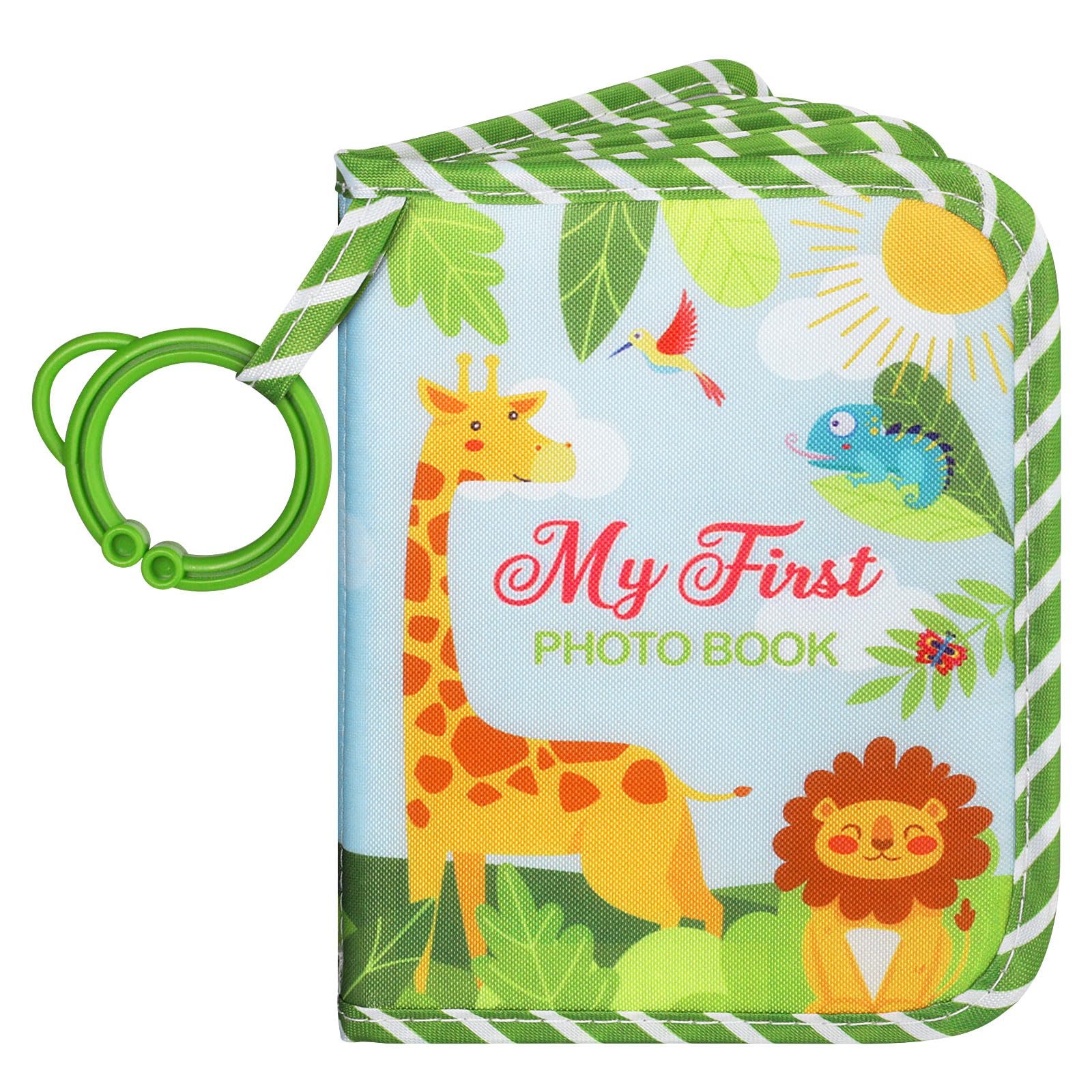 Size: with dimensions of 5.5 x 7 in, our family photo album can comfortably hold up to 4" x 6" photos; Plus, it comes with a handy teether ring that lets you attach it to any crib, stroller, or activity gym; You can even use it as a storybook for easy reading