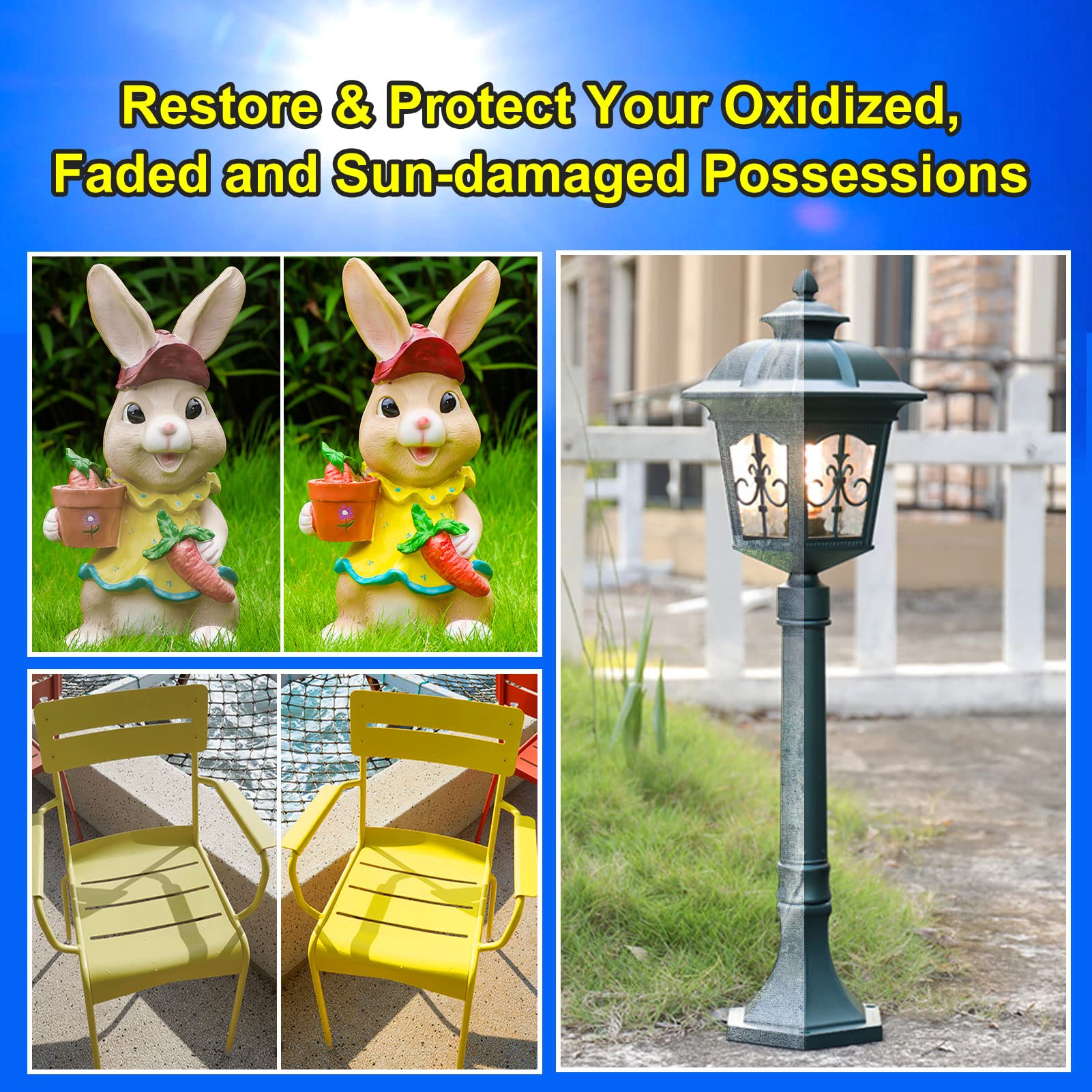 Widely Used : Renew and protect your grills, siding, shutters, mailboxes, aluminum fencing, plastic fencing, flower pots, doors, lighting fixtures, window trim, bumpers, automobiles, lawn equipment, tools, outdoor furniture, garden decorations, outside light fixtures and decoration, plastic, metal, vinyl, fiberglass, rubber, metal, outdo or accessories and more against from oxidation, fading and sun, salt, water damage.