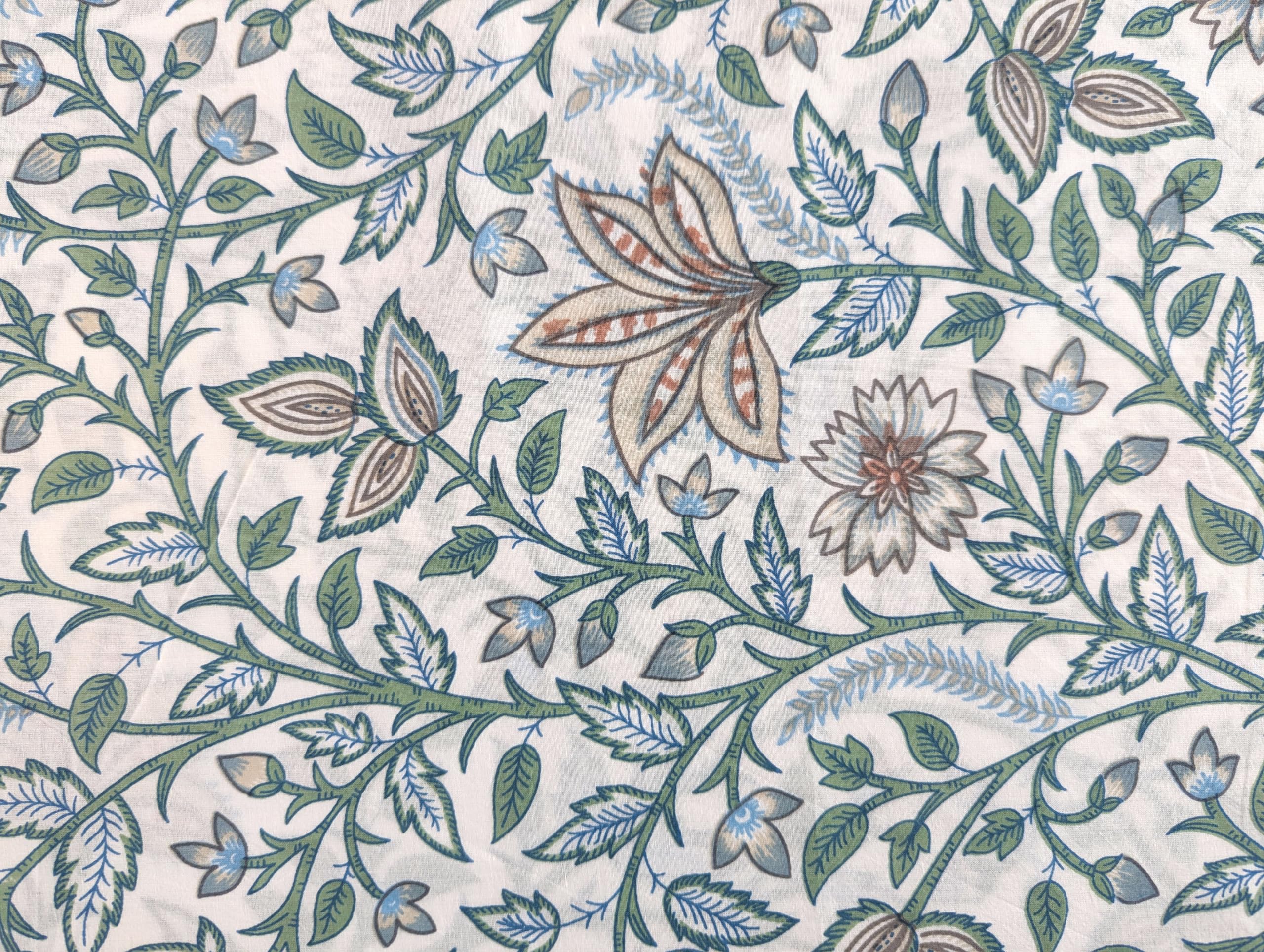 This is a hand printed fabric using wooden blocks or screens.