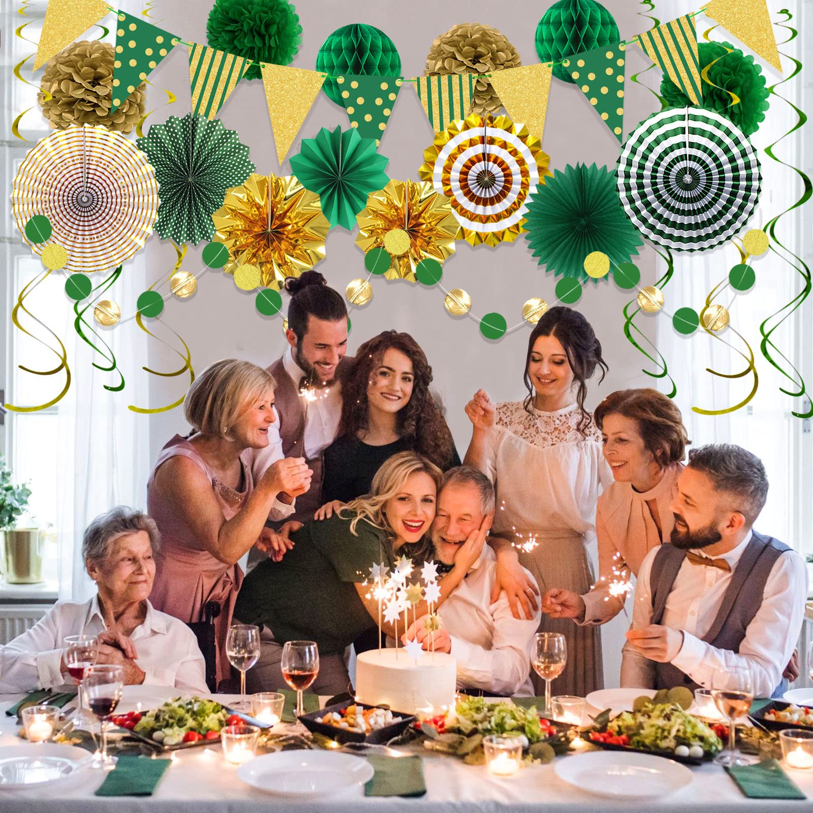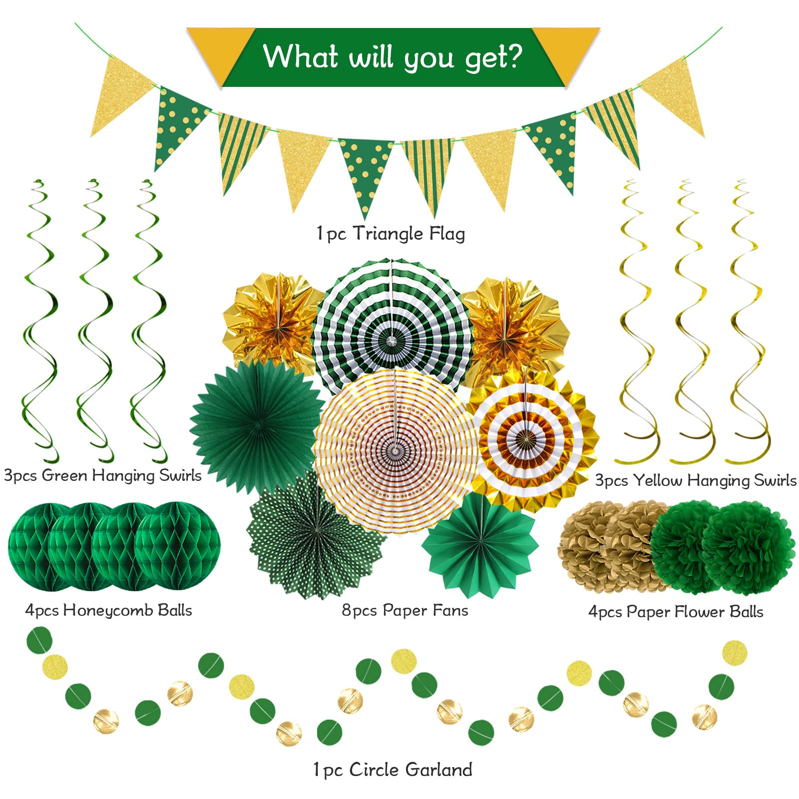 💛PACKAGE CONTAINS - Green and gold party decorations with 1pc 8.2ft triangle flag banner, 3pcs green + 3pcs gold hanging swirls, 4pcs 8in honeycomb balls, 4pcs 8in paper pom poms flowers, 8pcs hanging paper fans in diffrent size. The color combination is very unique.