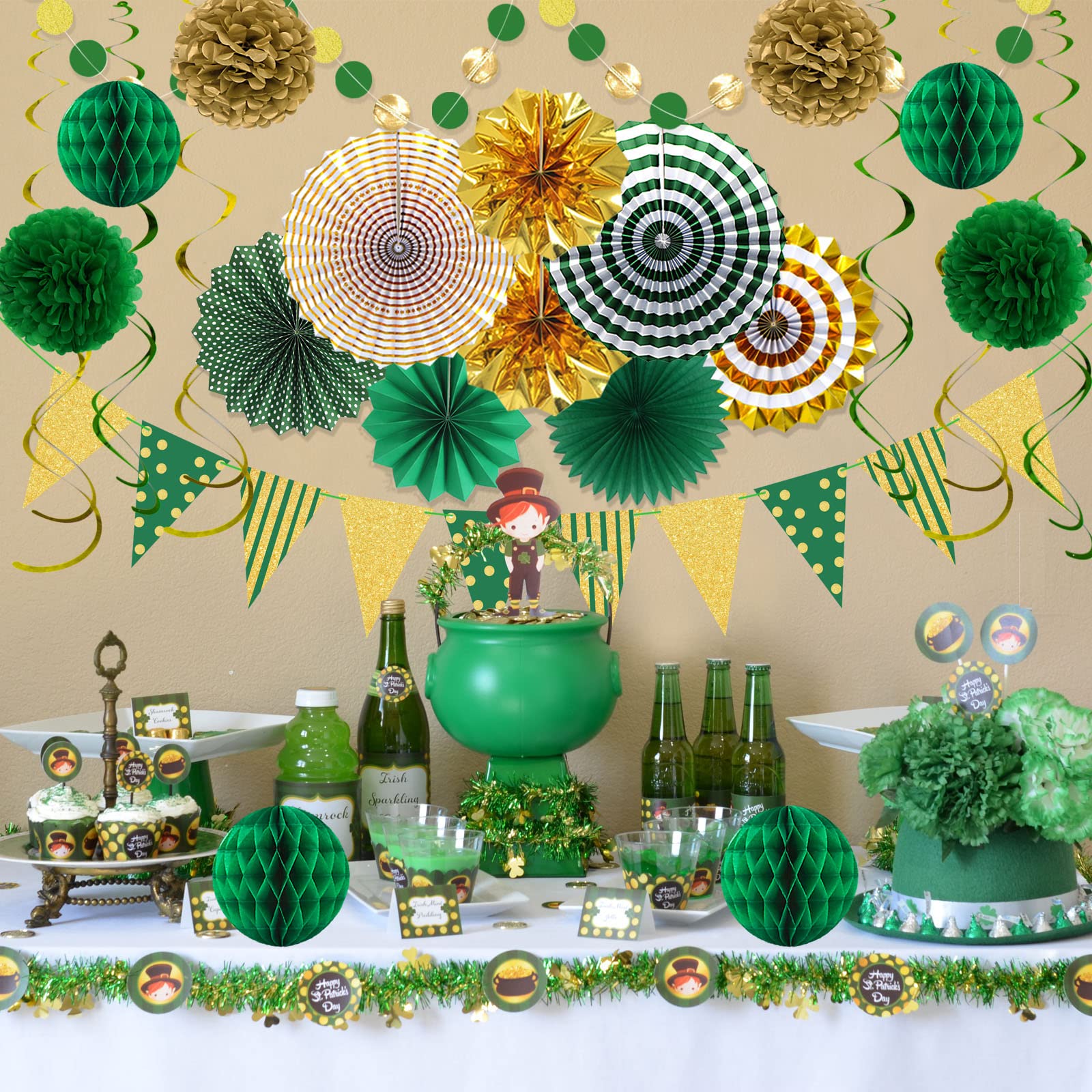 💚UNIQUE DESIGN - Whether it's St. Patrick's Day or graduation celebration. Unique green and gold party decorations will light up your party and have a huge impact. Triangular flags banner with patterns and paper fans that are different from each other. This design makes your party more vibrant and gorgeous. Which will fit the most theme parties and spice up the atmosphere.