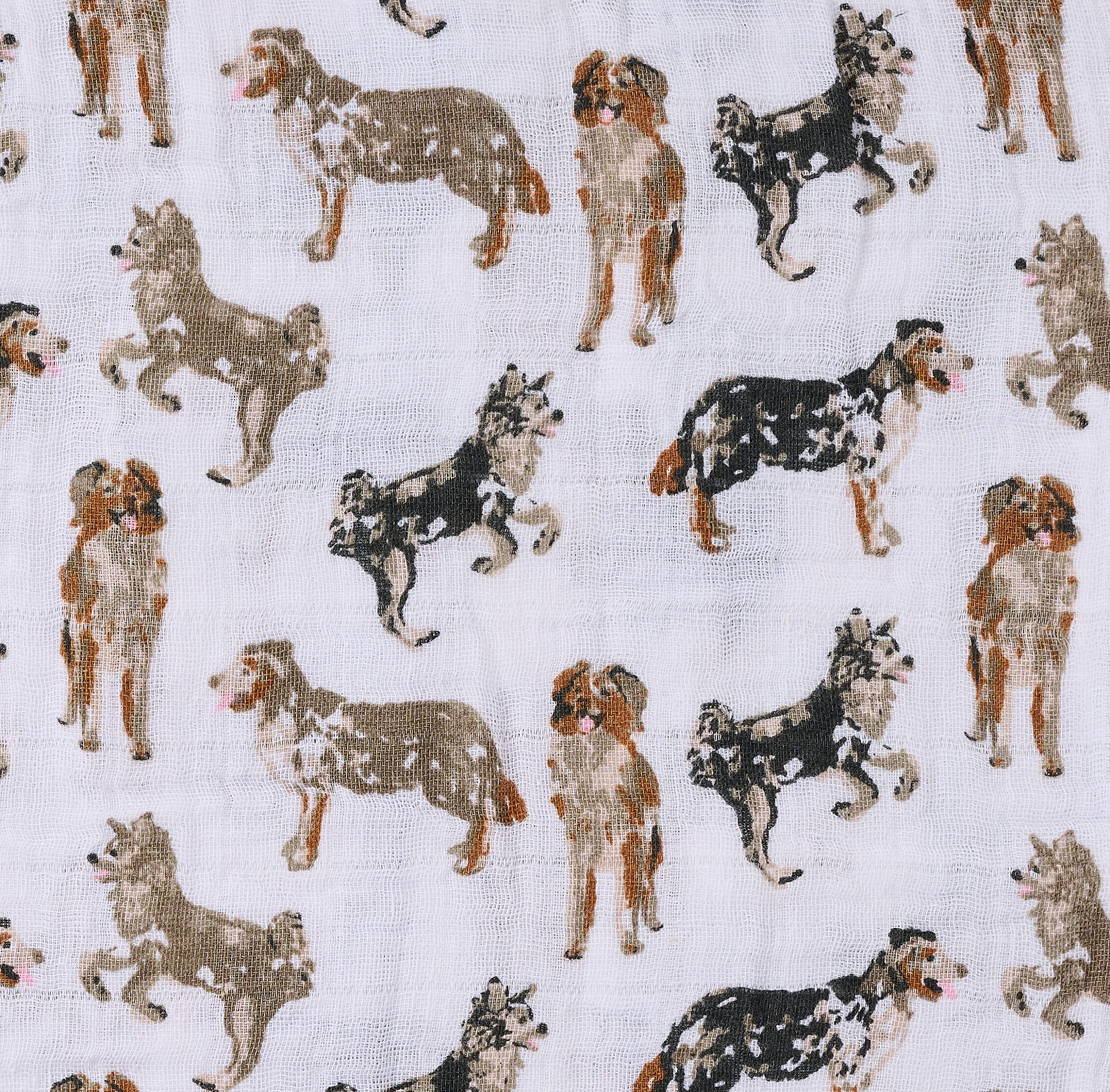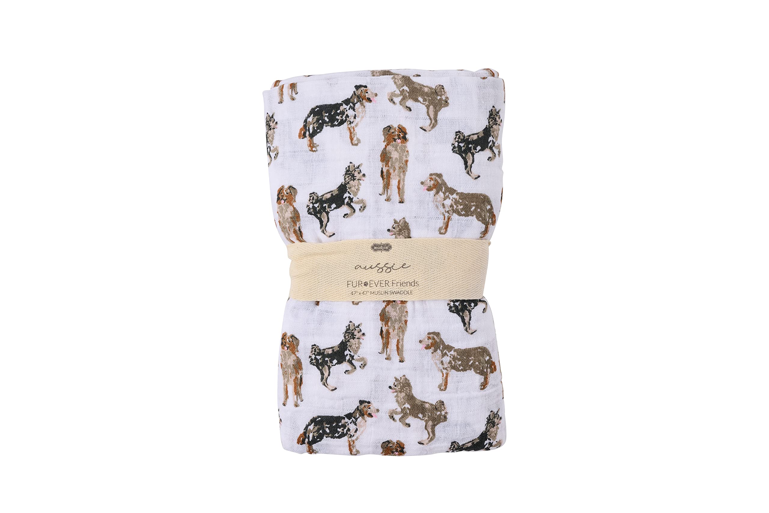 Calling all Aussie lovers - this Aussie swaddle blanket is a must have. The square swaddle blanket is made from muslin. The swaddle blanket features watercolor art print of various Australian shepherds. The blanket is made from cotton. The blanket measures 47" x 47". This swaddle blanket softens with every wash. This swaddle blanket makes the perfect gift! We recommend machine washing on cold, gentle cycle. The blanket arrives with Kraft paper tag.