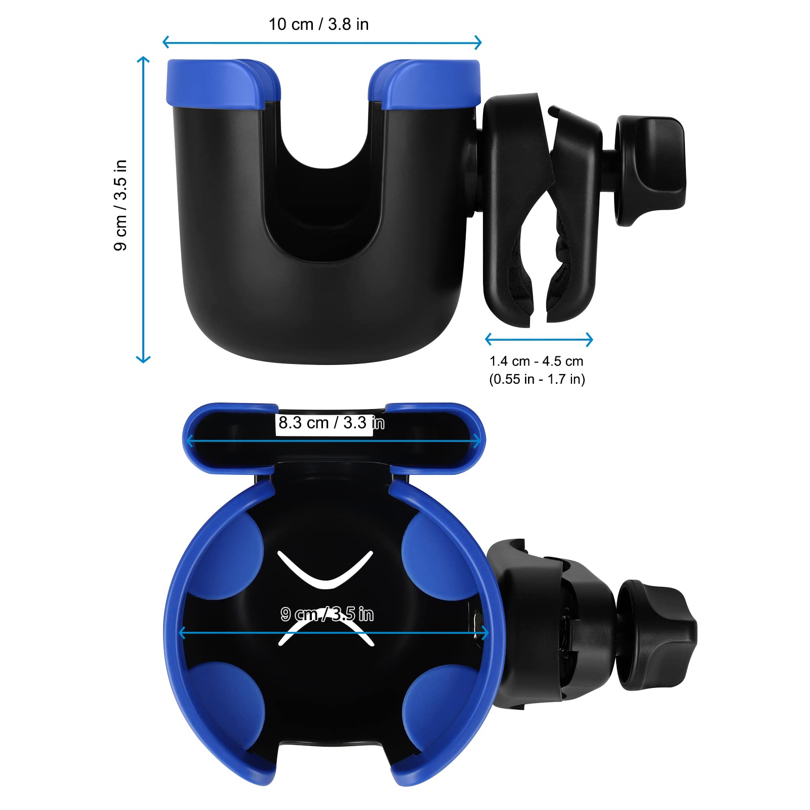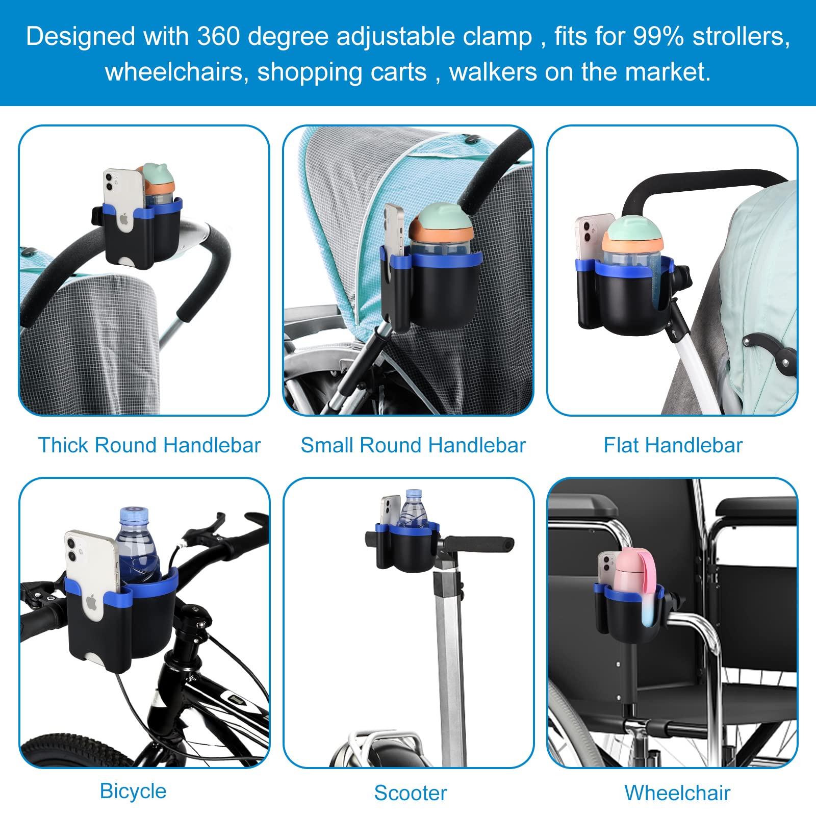 Wide Compatibility: This universal cup holder with phone holder compatible with most baby strollers, walker, wheelchair, rollator, bike, scooter, boat handle bar, shopping cart, kayak, ATV, lawnmowers, motorcycle, treadmill, golf push cart and so on.