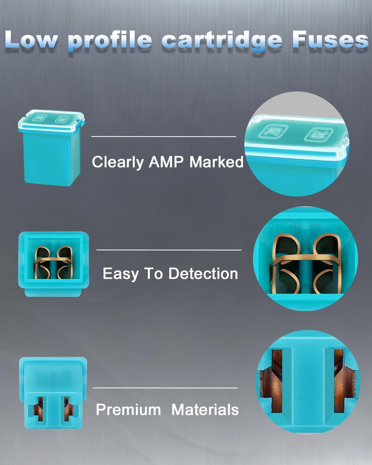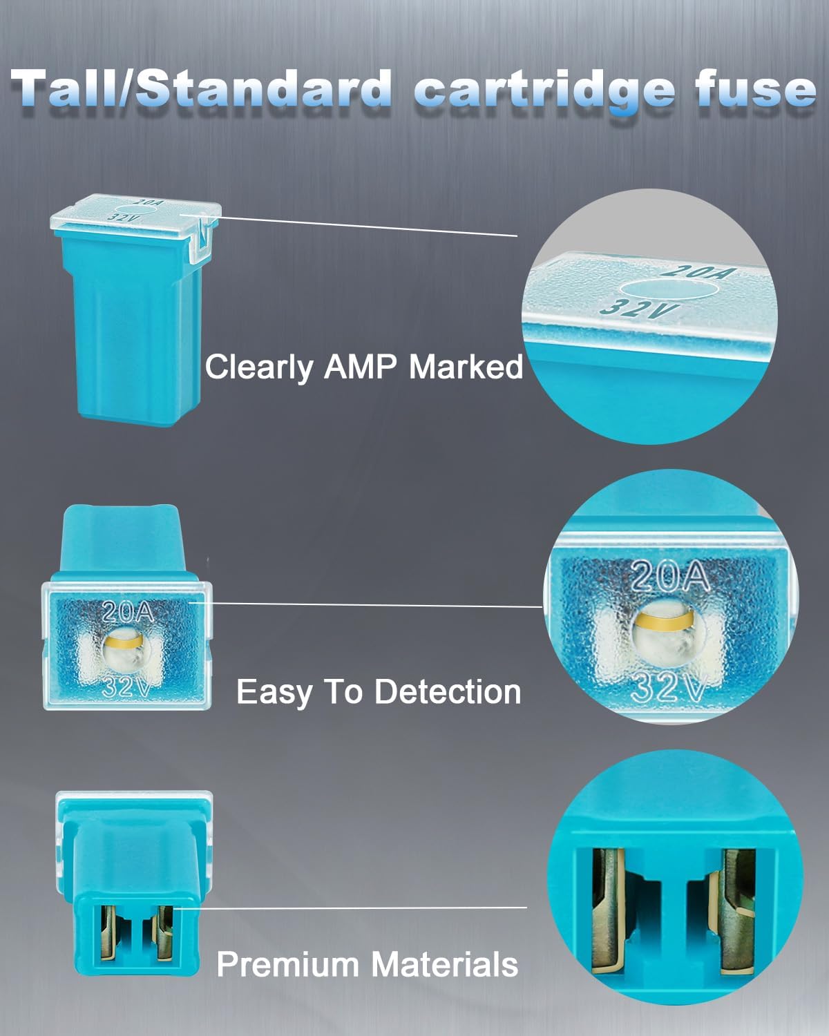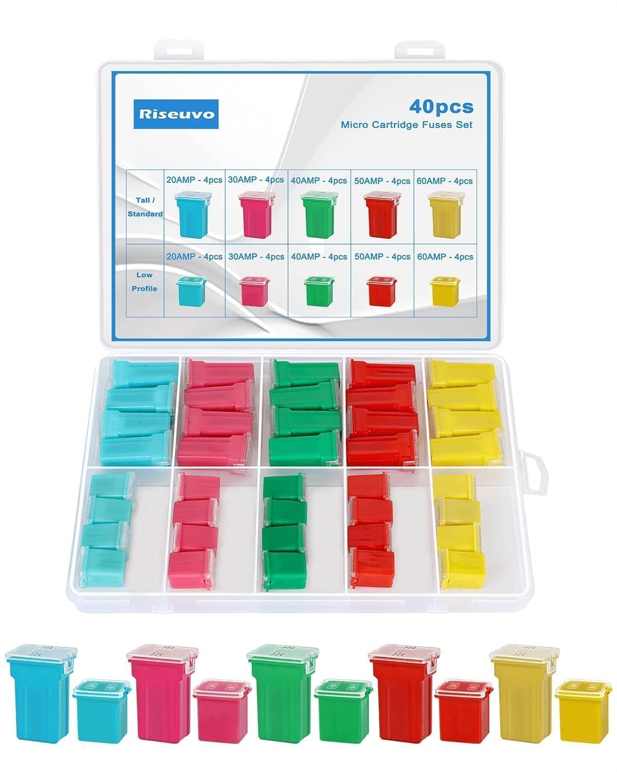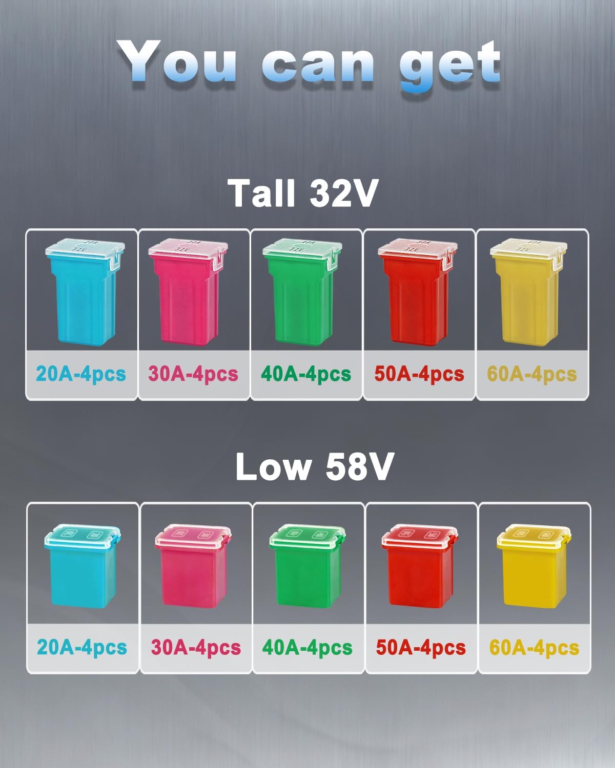 EXCELLENT CAR SPARE FUSE KIT - Voltage:58V/32V, Current: 20A, 30A, 40A, 50A, 60A, Size: low profile and tall/standard , variety of amperage specifications to keep you prepared in case of an emergency.Please confirm that the size you need before placing the order.