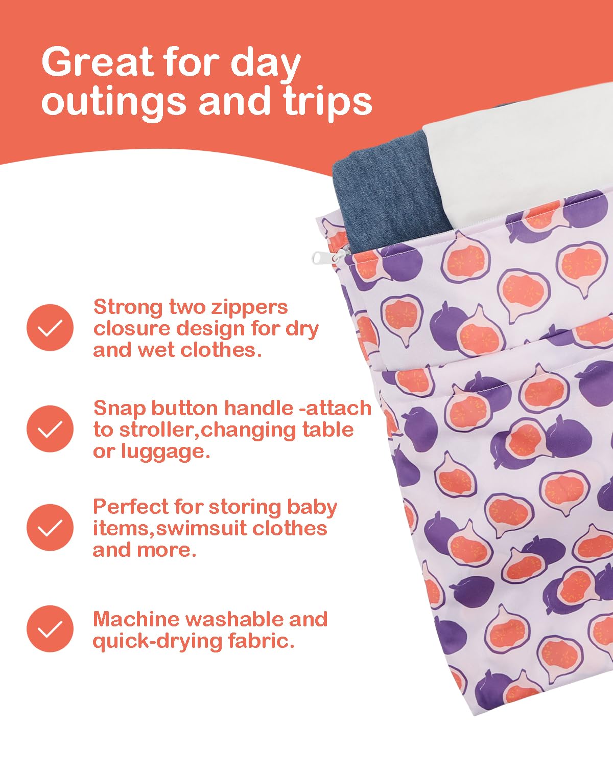 ALVABABY Wet Dry Bags: Truly wonderful bags that allow you to carry your wet and dry items in the same bags. Each bag contains a "wet" section that is sewn and sealed for no wicking or leaking AND a zippered dry section for keeping dry diapers or inserts. Carry all your items in one bag while keeping your items dry and your wet or soiled items separately. Truly all in one bags! Features: 1,Fashion&Stylish, Reusable&Waterproof, High quality: A trim and attractive design. ALVABABY wet/dry bag are made from waterproof 100% polyester, put dirty cloth diapers in a wet bag. Comes with SNAP handle for easy carrying or attaching to your diaper bag or stroller. 2,Double Zippered: TWO Zippered compartments for keep wet and dry things separate. Each bag contains a "wet" section that is sewn and sealed for no wicking or leaking. 3,Enough Space: 30cm x 36cm (approx.:11.5 in x 14 in),Holds approximately 5-7 cloth diapers. Light weight, easy to carry (less than 50 g). 4,Multi-functional Bags: A truly wonderful bag that allows you to carry your wet and dry items in the same bag. Carry all your items in one bag while keeping your dry items dry and your wet or soiled items separate. Truly an all in one bag! They can be used as diaper wet dry bags, travel bags, storage bags, cosmetic bags, handbags, wash bag, organizer bags. Also great for swimming suits or other wet items.