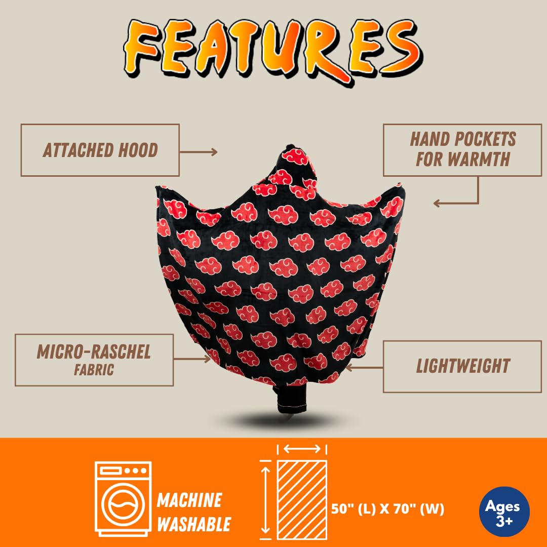 NARUTO DESIGN: Cozy up for a manga marathon with your favorite Naruto characters and this stylish hooded throw. The bold black background showcases the red Akatsuki Clouds to represent justice in war.