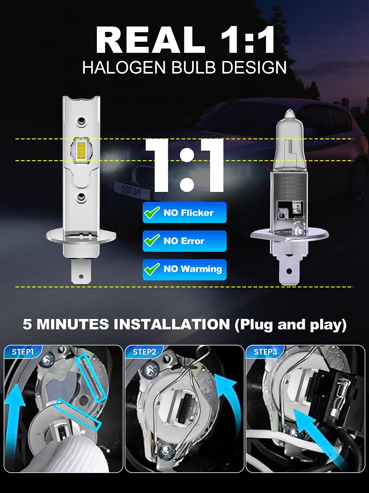Precision H1 Bulb Fit:Featuring true OEM-specification dimensions, these H1 fog light bulbs install seamlessly into factory housings. The advanced 1:1 mini design ensures perfect alignment and beam pattern integrity with zero modification required