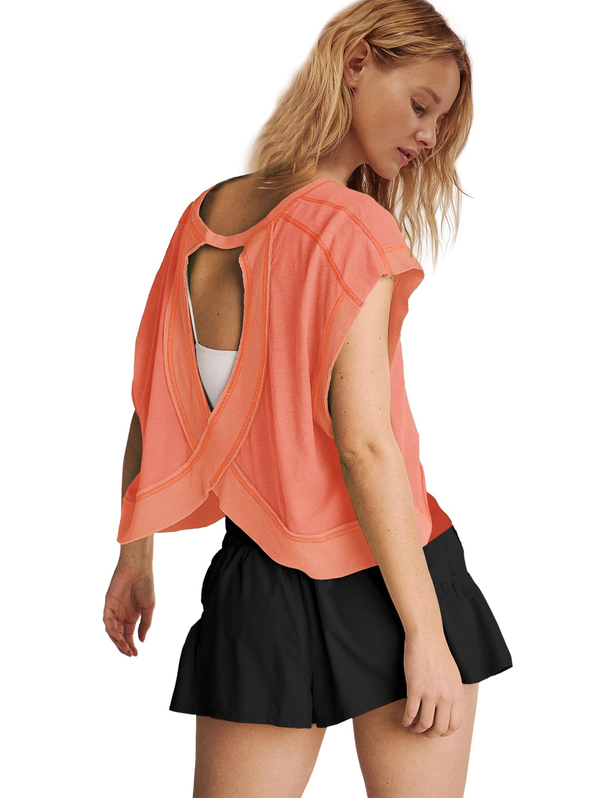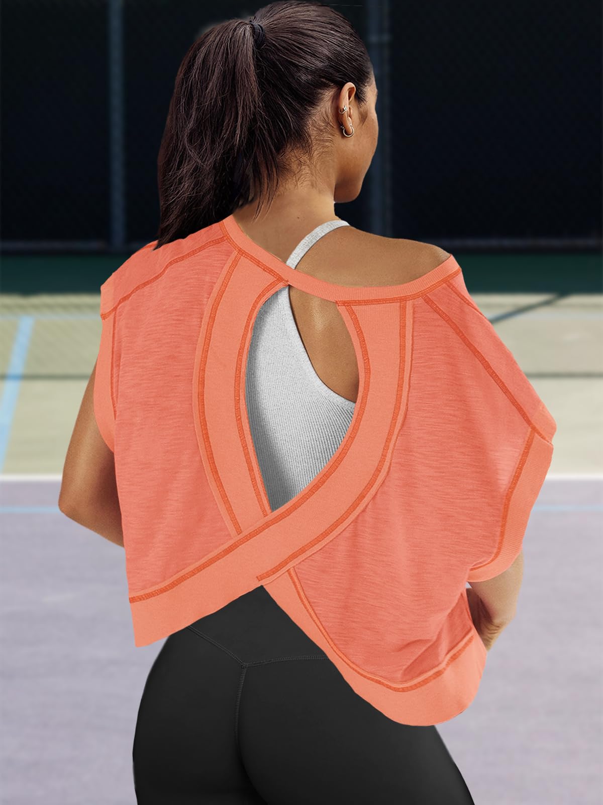Fit: Please order your regular US size. The workout tshirts for women is an oversized style that not only flatters your figure but also pairs effortlessly with any outfit. If you want a more comfy loose fit for this womens open back tops, suggest ordering one size larger.