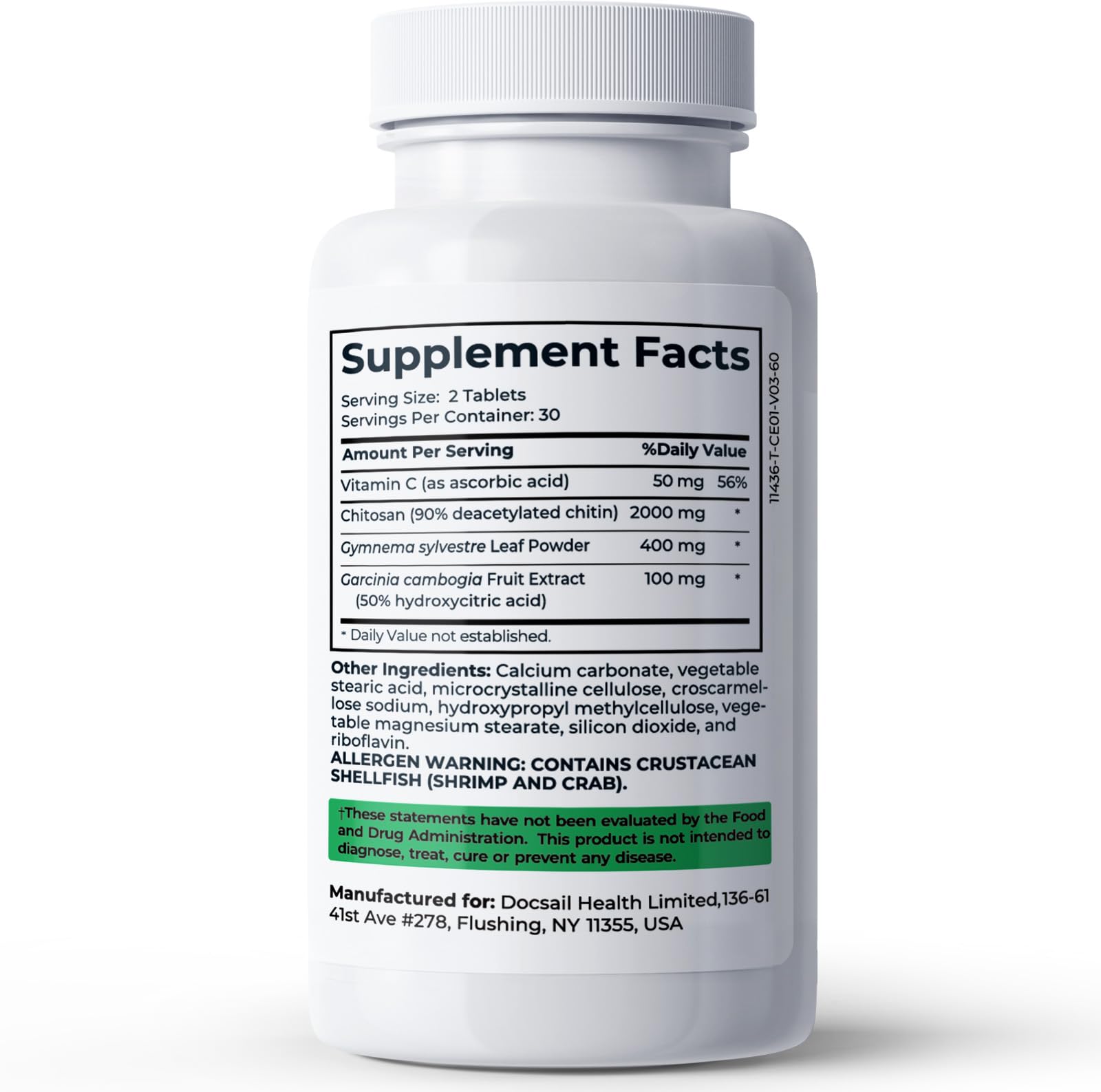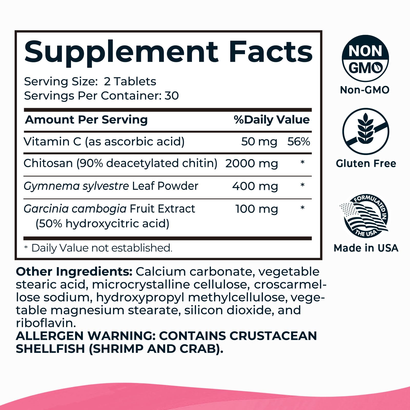 High absorption 2550mg per serving with Chitosan 2000mg,vitamin C 50mg and Gymnema Sylvestre 400mg