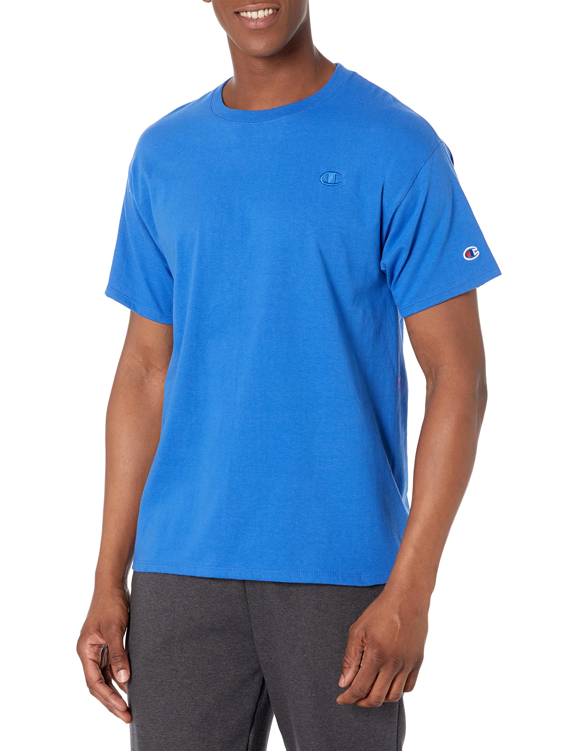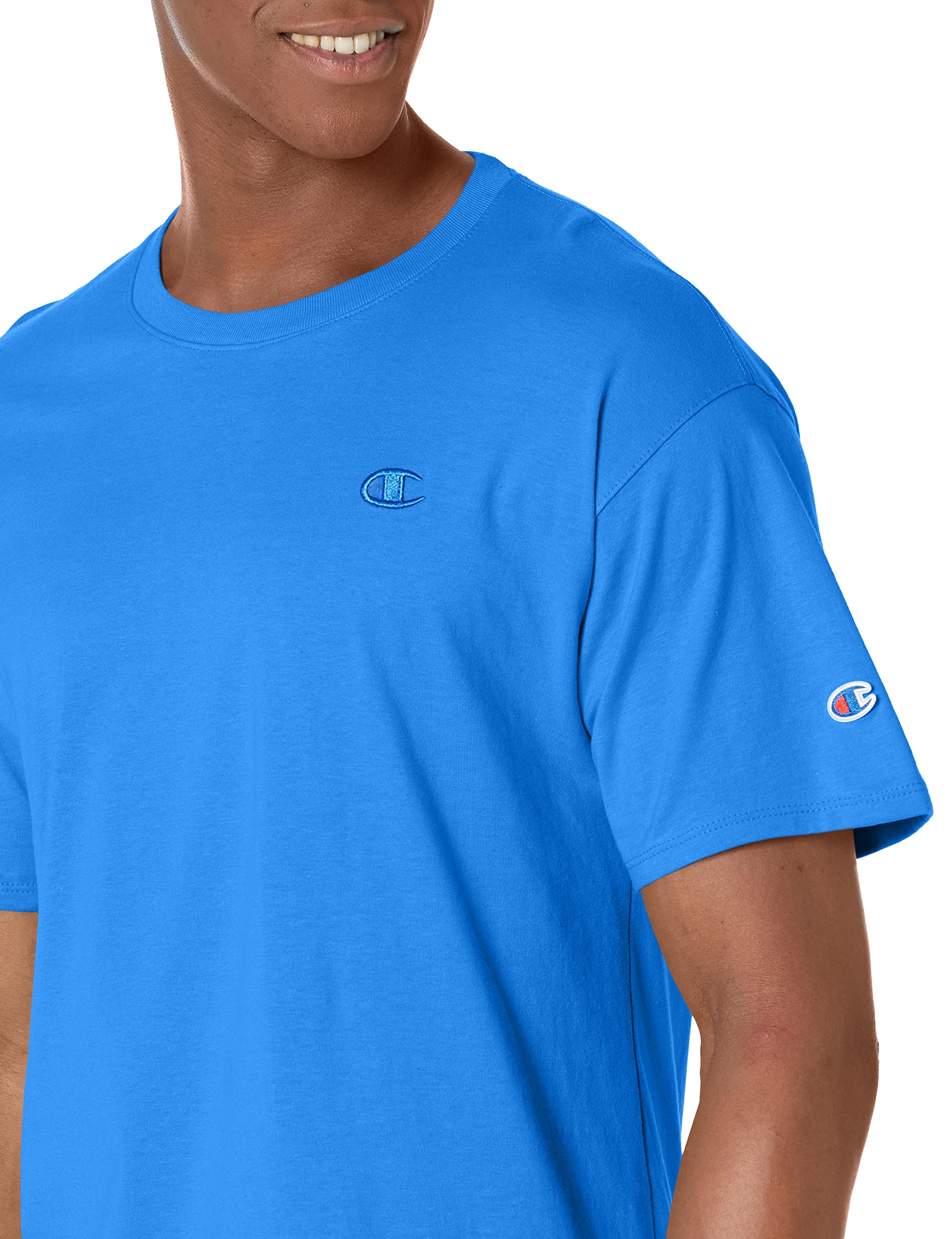 Description TIMELESS THREADS. Add lived-in comfort to your daily rotation with this T-shirt for men, expertly crafted from a soft cotton or cotton blend. Cut for a standard fit, it's detailed with a shape-holding ribbed crewneck, short sleeves, and matching back neck tape for no-irritation comfort. This classic men's T-shirt style is a must-have that pairs well with sweats and shorts for a rounded-out sporty look. Finished with the iconic C logo patch embroidered at the chest for an authentic look.