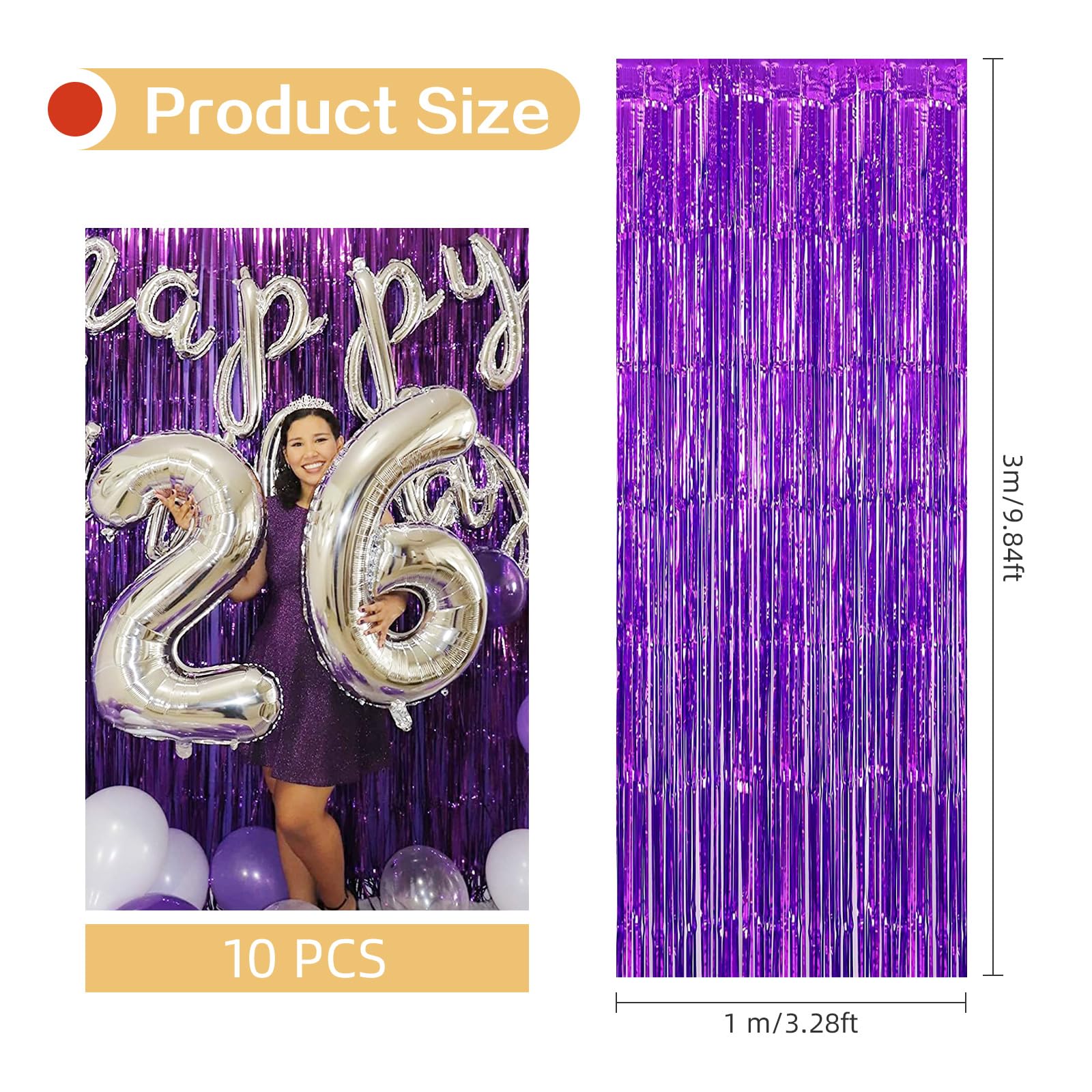 {Package and Size}: 5 Pack. Each pack size (W x L): 3.2ft x 9.8ft /1m x 3m. This 9.8 ft long and 3.2 ft wide foil fringe curtain can cover a wide area and can be cut to the required length and style to create the perfect background decoration.