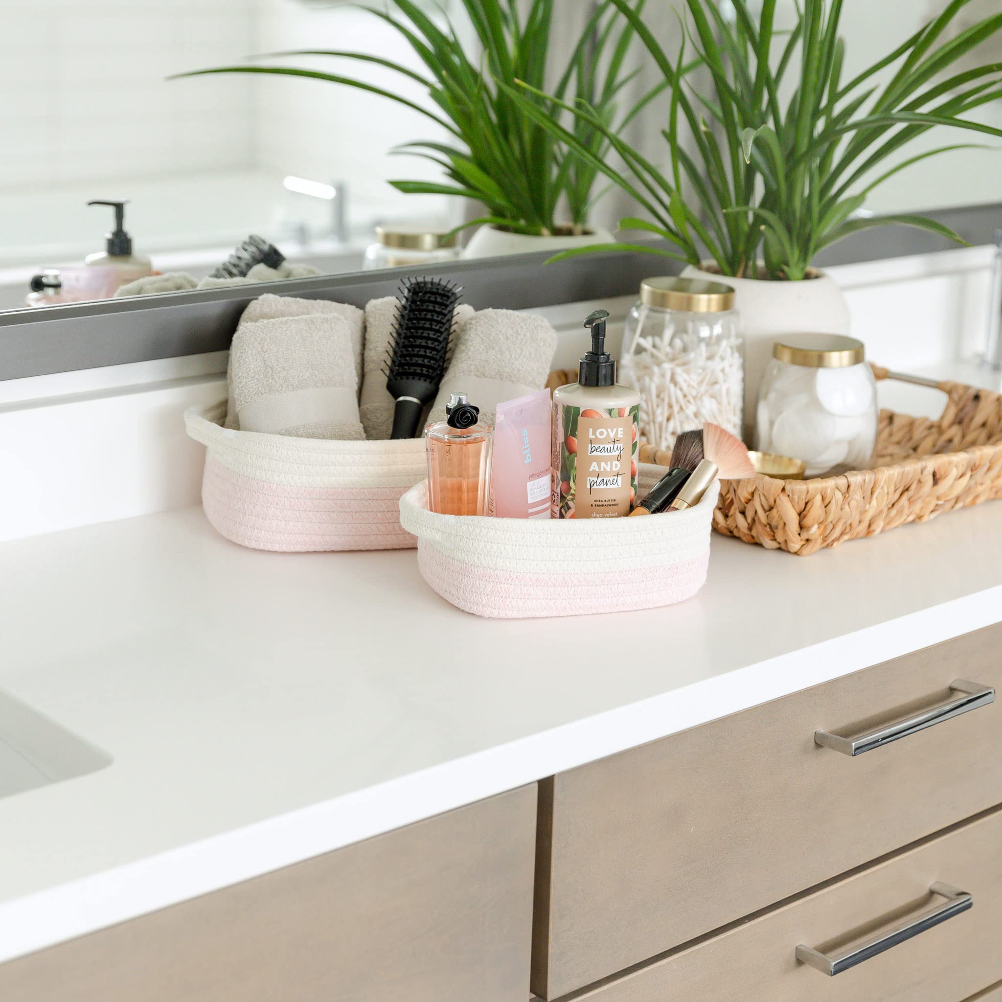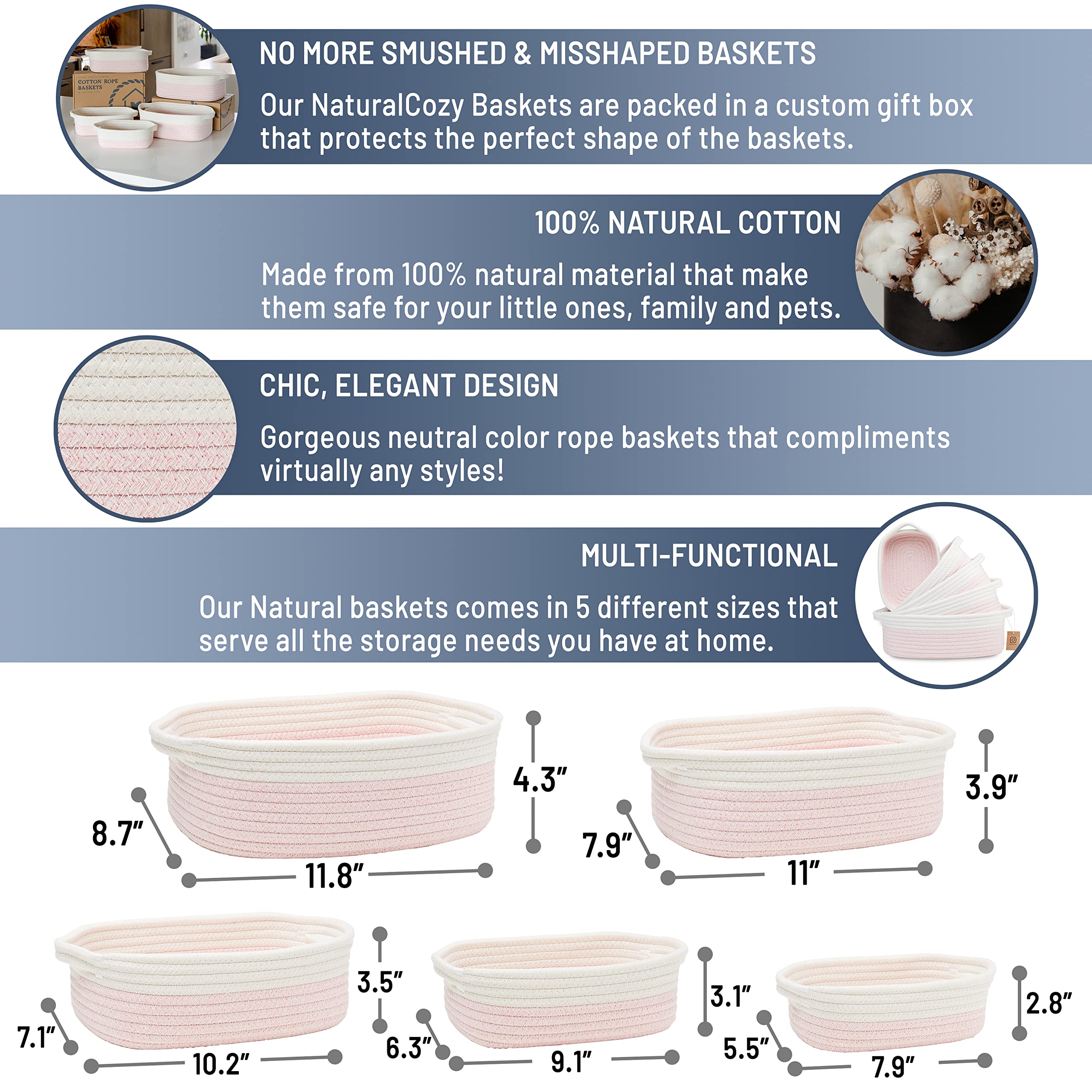 5 BASKETS FOR 5X THE ORGANIZING POWER: Life is messy...but your house doesn’t have to be! With 5 beautiful rope baskets for organizing, you’ll defeat messy rooms like a true supermom! Use the largest baskets for Montessori displays or countertop fruits holder, create the cutest dog toy storage or bathroom hand towel holder with the medium ones and stash jewelry or keys in the smallest. Biggest (11.8"x8.7"x4.3"), (11"x7.9"x3.9"), (10.2"x7.1"x3.5"), (9.1"x6.3"x3.1"), Smallest (7.9x5.5"x2.8")