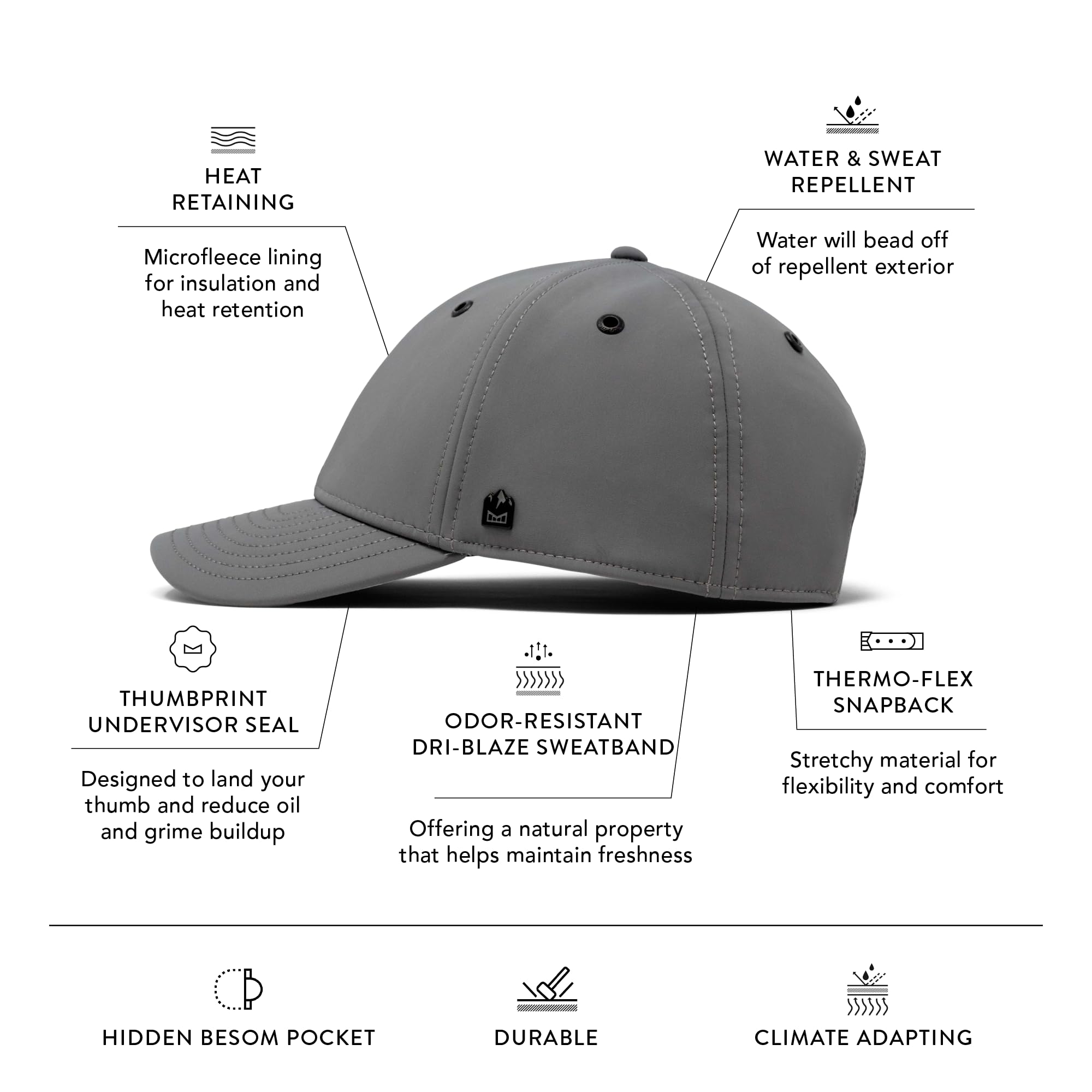 WATER & SWEAT REPELLENT: The melin A-Game Hydro unisex hat features a durable, breathable design that combines hydrophobic technology designed to repel water and prevent absorption, and moisture-wicking lining to keep your hat and head dry