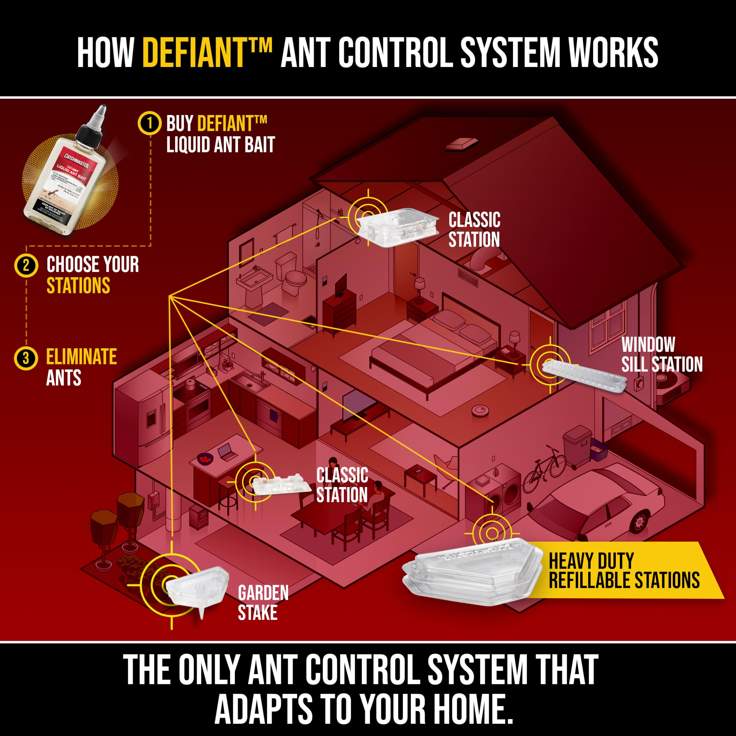 DEFIANT ANT CONTROL SYSTEM: DEFIANT Ant Control System is the only ant control solution that adapts to your home and your needs. Use the reusable ant traps indoor or outdoor, anywhere ants invade. The triple-entry design is optimized for maximum ant interception from multiple directions.