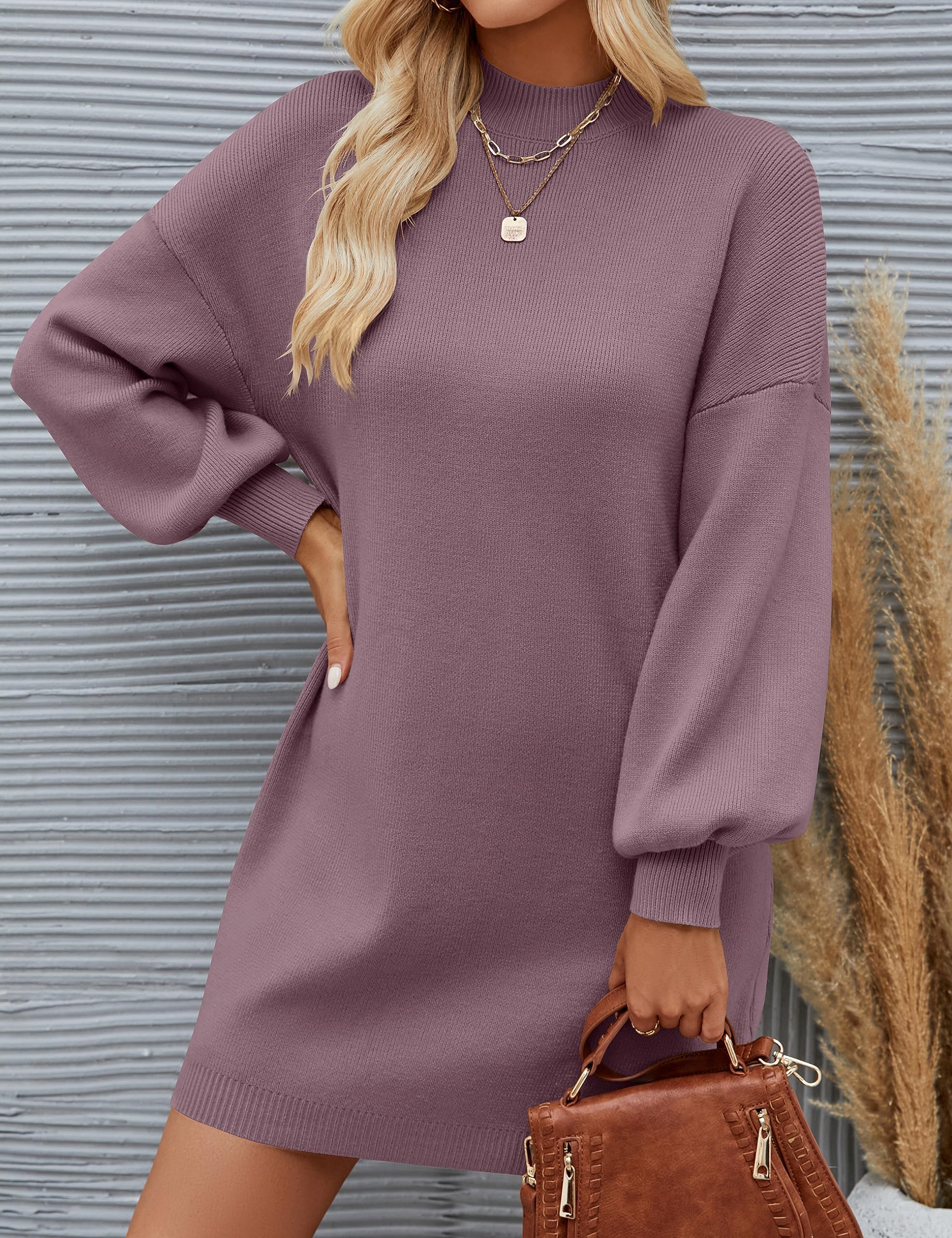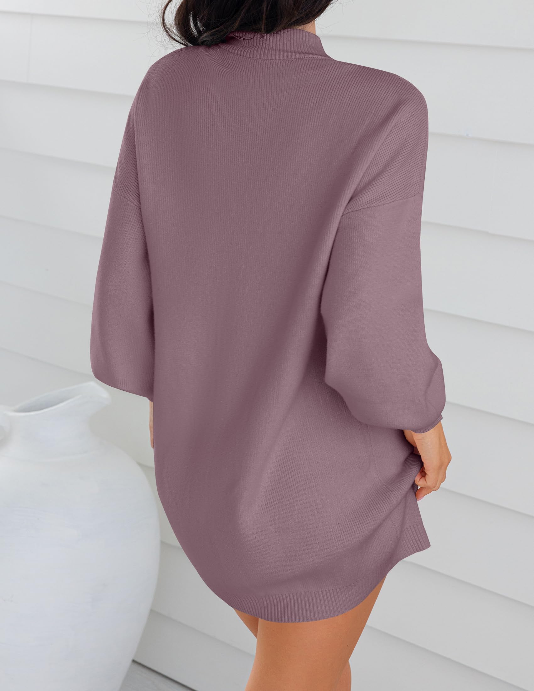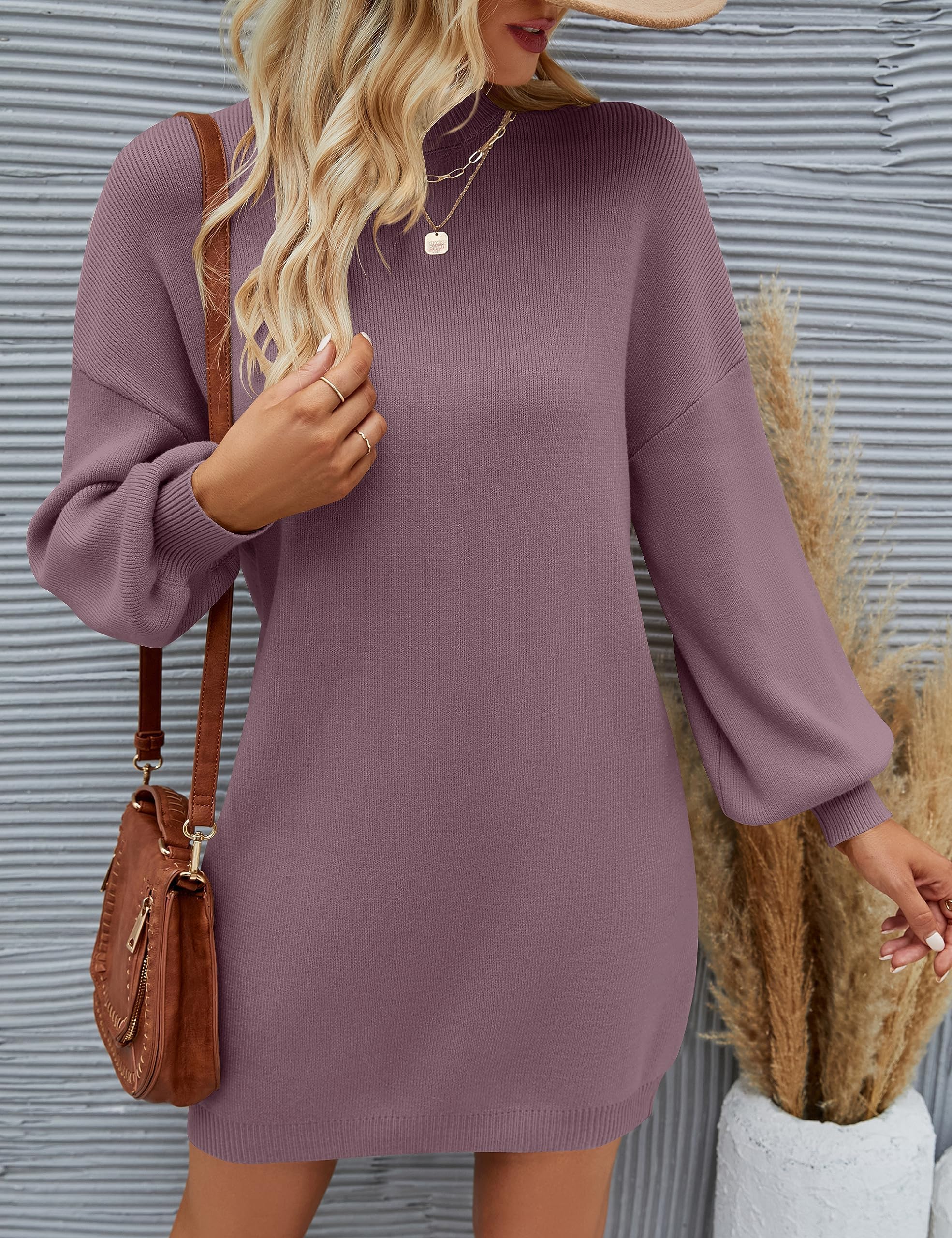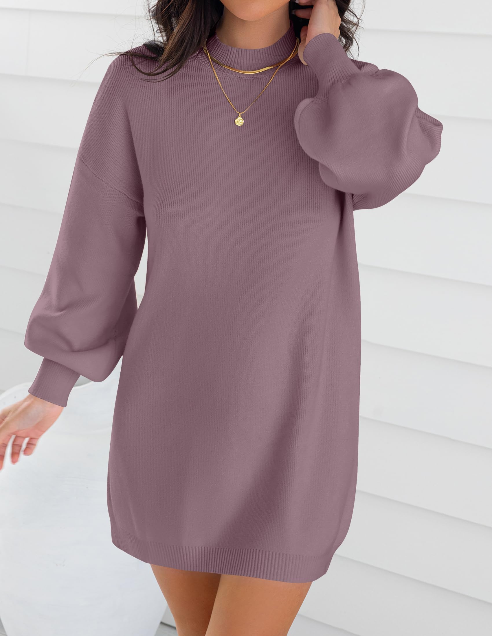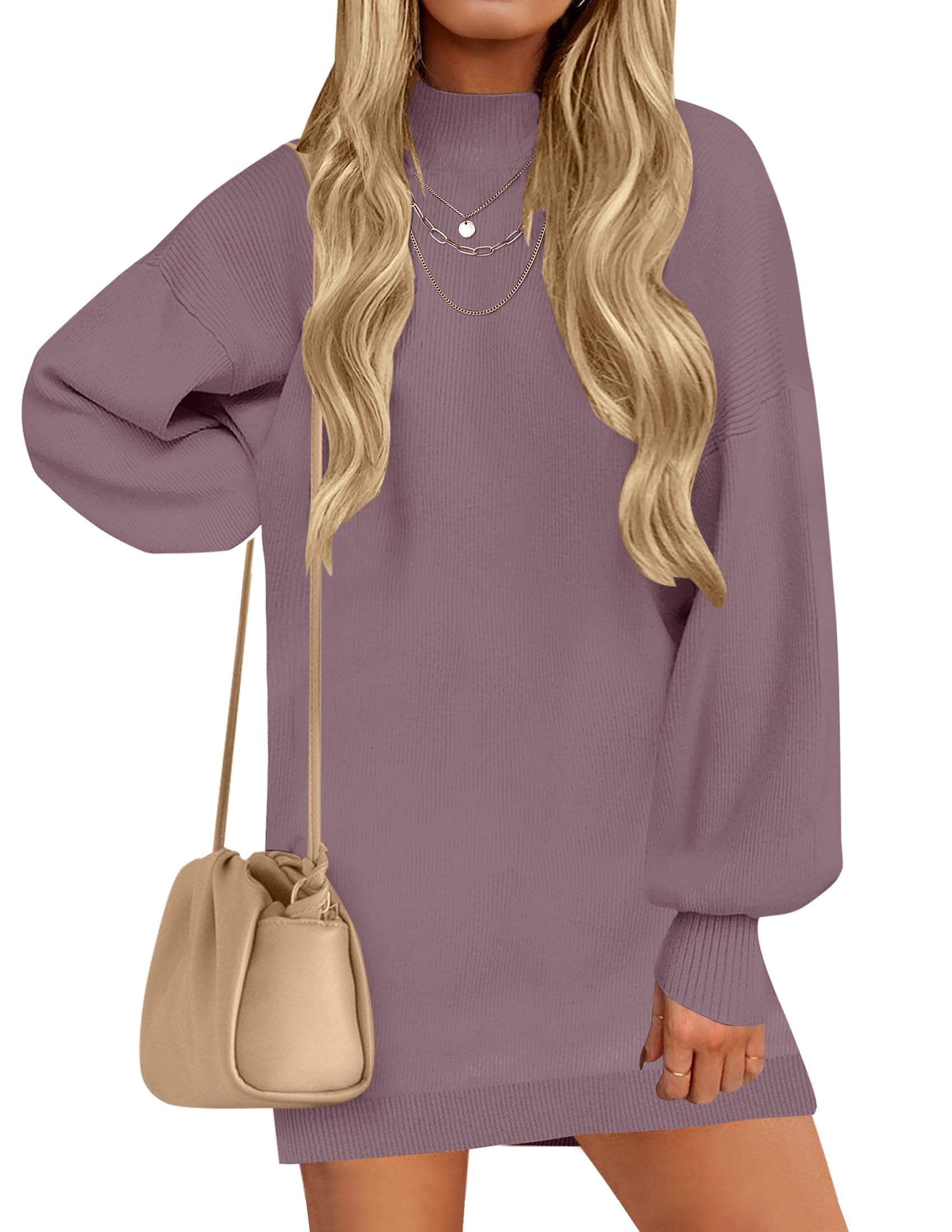 Sweater dresses for women 2025, mini dresses for women, fall sweater dress, lantern long sleeve dress, ribbed knit dress, mock neck, loose fit, classic solid color, above knee length, slouchy and baggy style, maternity dress, winter dress, cocktail party dress