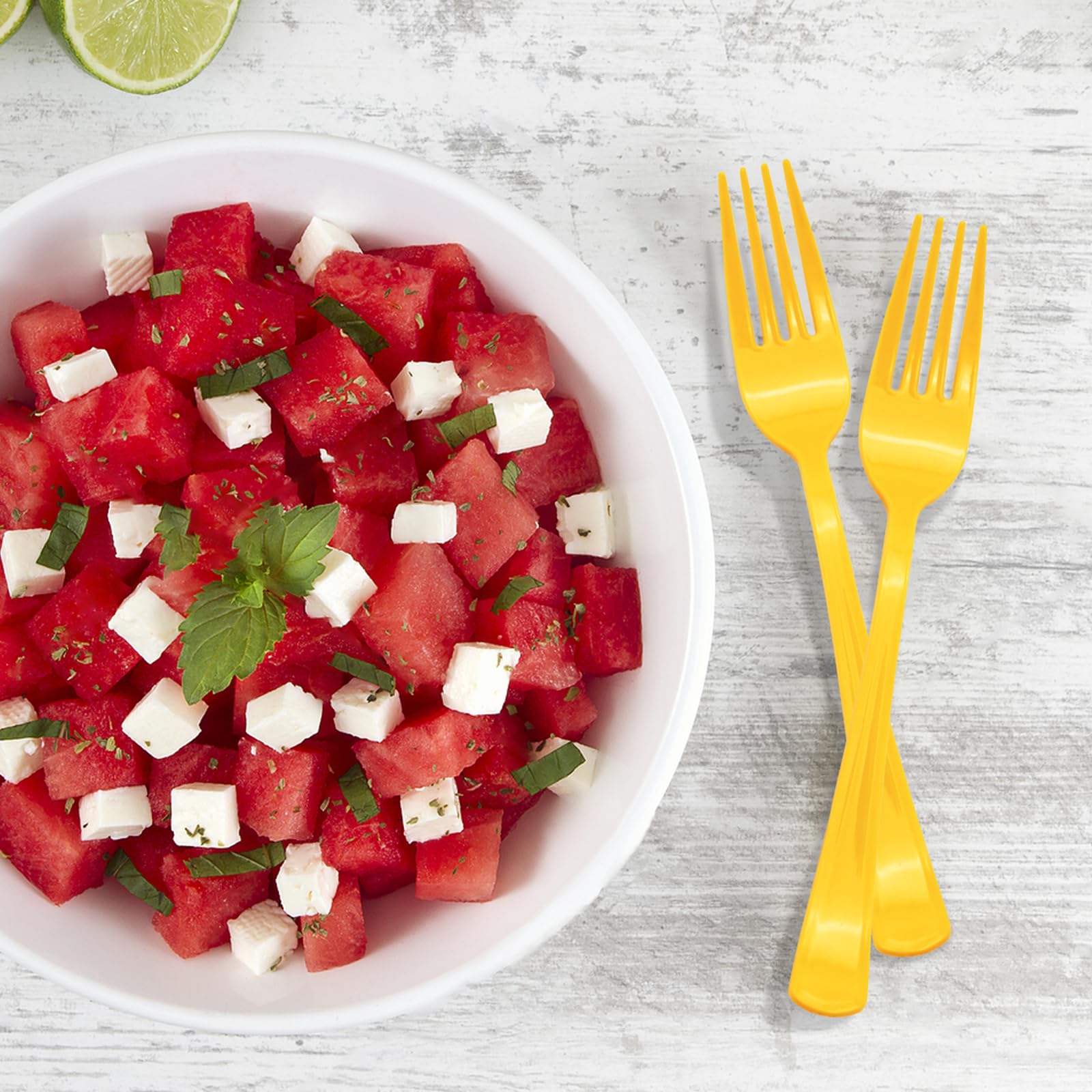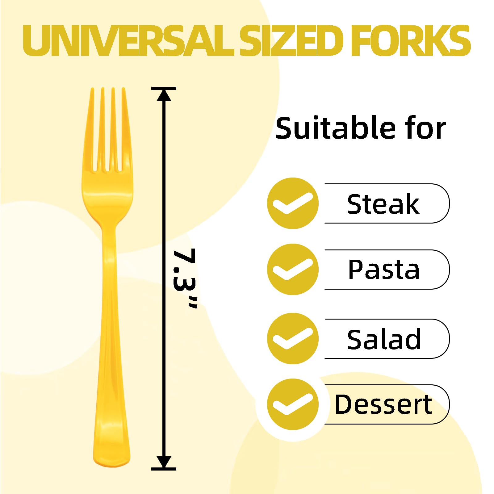 【Sufficient Quantity】: Includes 50 pack of heavy-duty 7.3 inch yellow plastic forks. Perfect for Easter, wedding, birthday, baby shower , picnic or whatever your celebrated event is. Offering multiple different color options, they are sure to match your decor.
