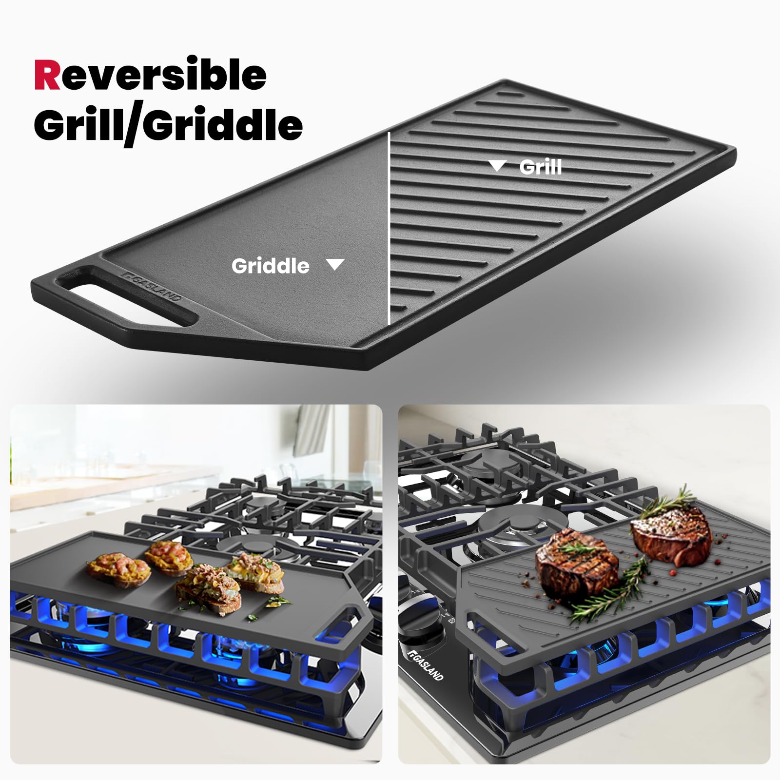 【2-in-1 Reversible Grill & Griddle】Cast iron for heavy duty, premium-grade steel and iron, masters heat distribution for excellent heat retention and the perfect sear. Grill ridges for nice sear marks. Comfortable wide handle for easy-grip.