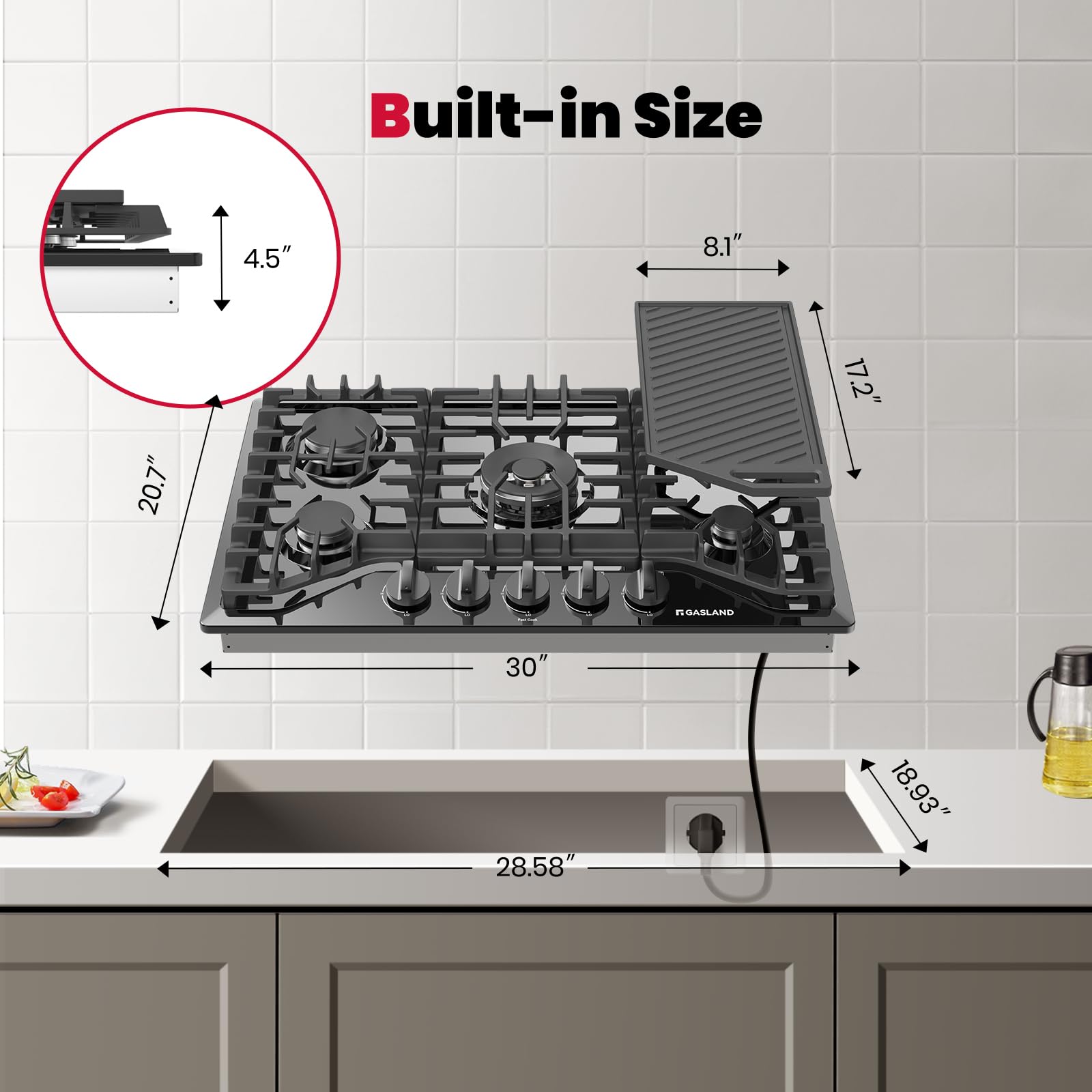 【Easy Maintenance】Built with black enamel surface, resists stain, heat and discoloration. 5 sealed burners prevent food from dropping into them. You can simply remove the grates and wipe it clean with water or detergent. The automatic electric pulse ignition uses a 120V AC power(Come with 3.9FT cord plug), which will become more convenience for your life. The built-in size is 28.6" x 18.9" while the whole product size is 30.0" x 20.0" x 3.9" for this built in gas cooktop.
