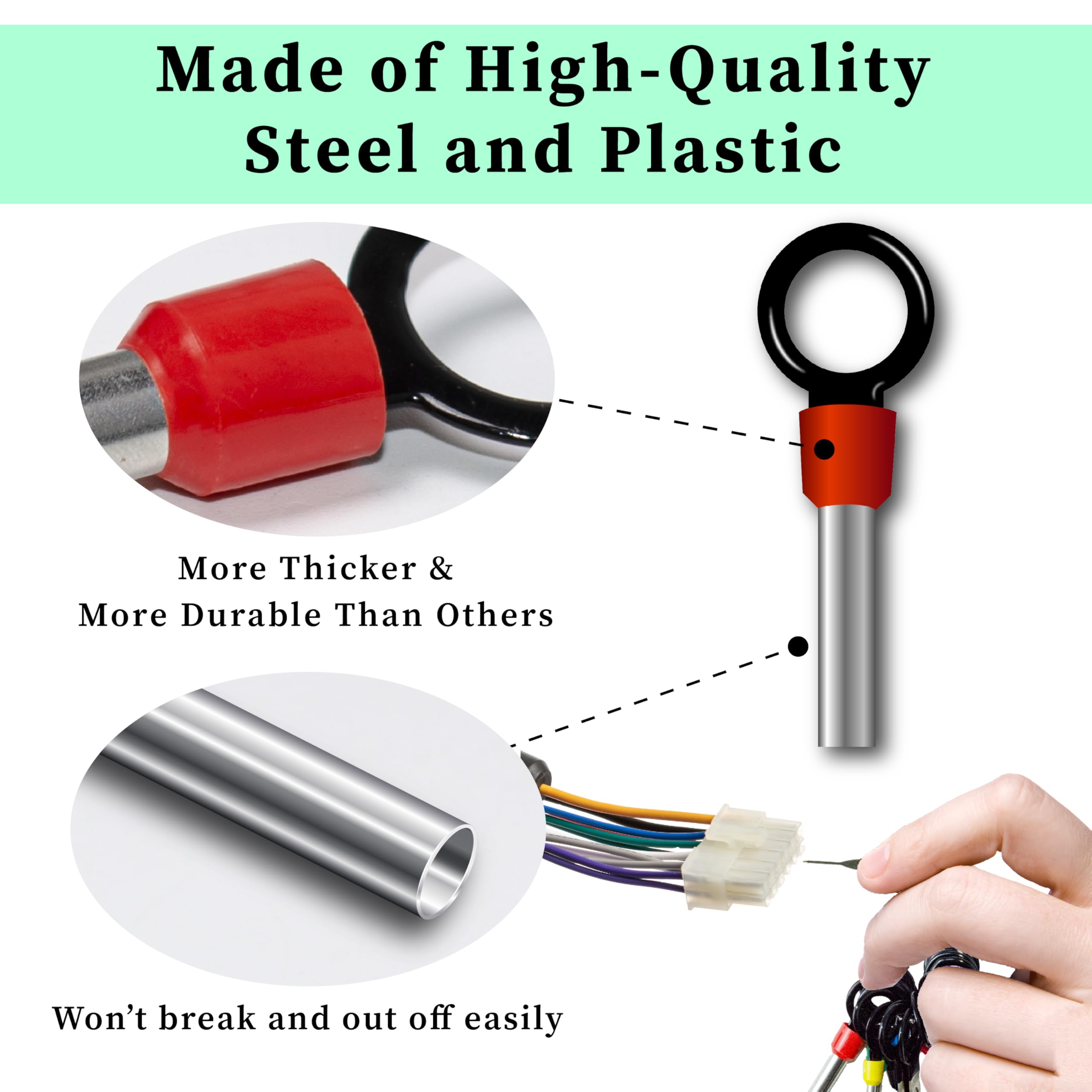 High Quality: The depinning tools are made of premium quality steel and plastic, strong and durable, would not easily get out of shape, can be used repeatedly. The O ring handle make it more safe to operate the terminal pins connectors