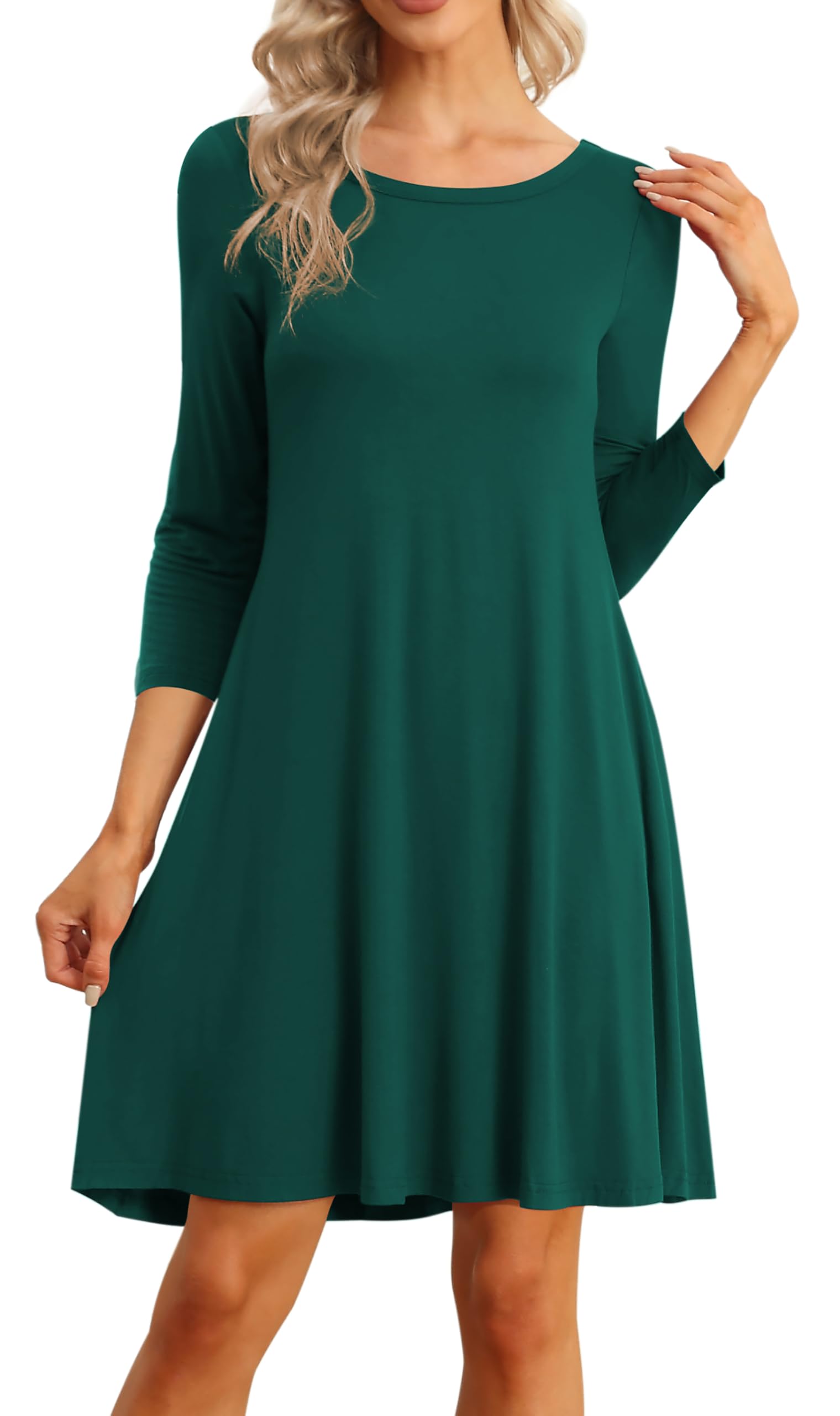 Features: casual basic style, A-line silhouette, 3/4 sleeves/sleeveless ,round neck, super soft.the casual dresses is above the knees and long enough that you wouldn't need to wear leggings with it if you didn't want too.It's a swing style so it would fit comofrtably over large hips.the pockets are such a nice addition,it's loose enough but not baggy.