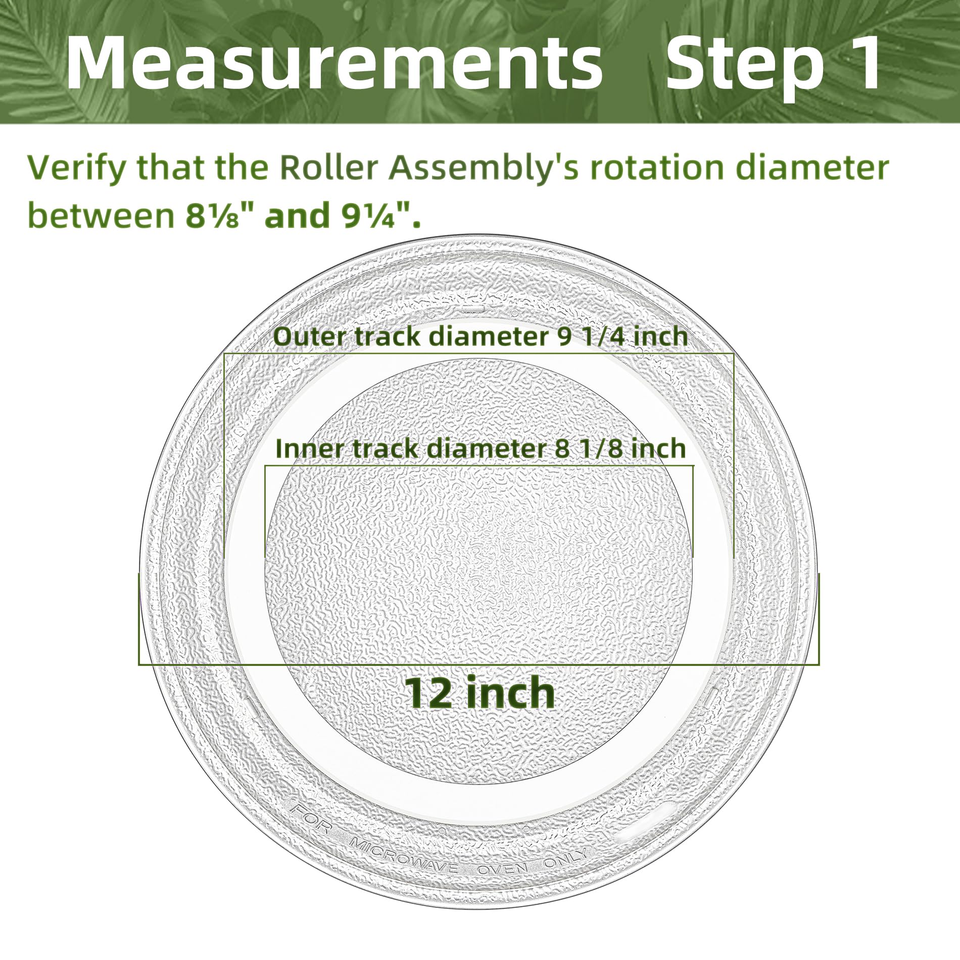 【Measurement 1】 This 12" microwave glass turntable plate is a flat-bottom glass plate, compatible with a roller assembly of 4 5/8-inch radius. (The measurement is taken from the outermost edge of the roller to the center of the roller assembly)