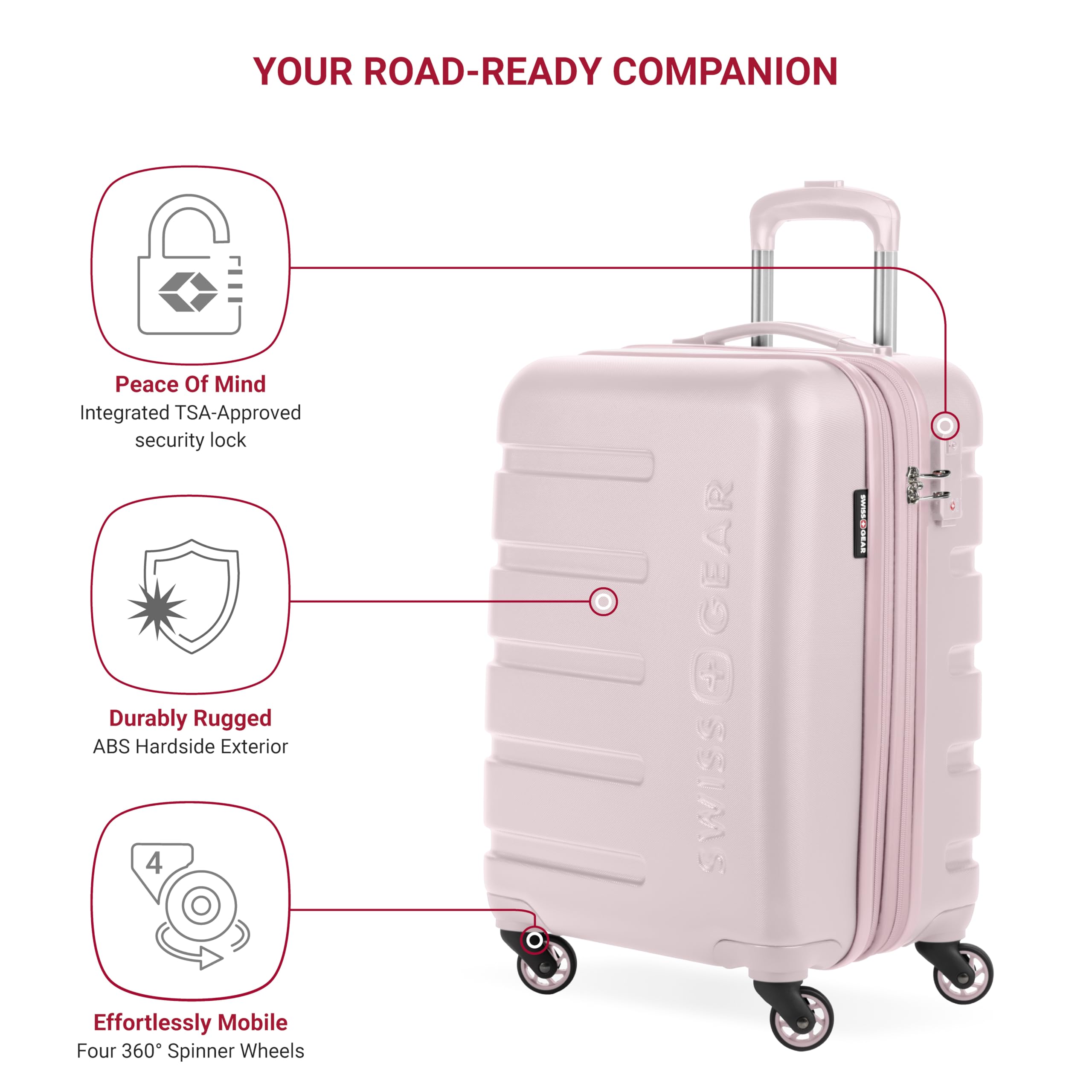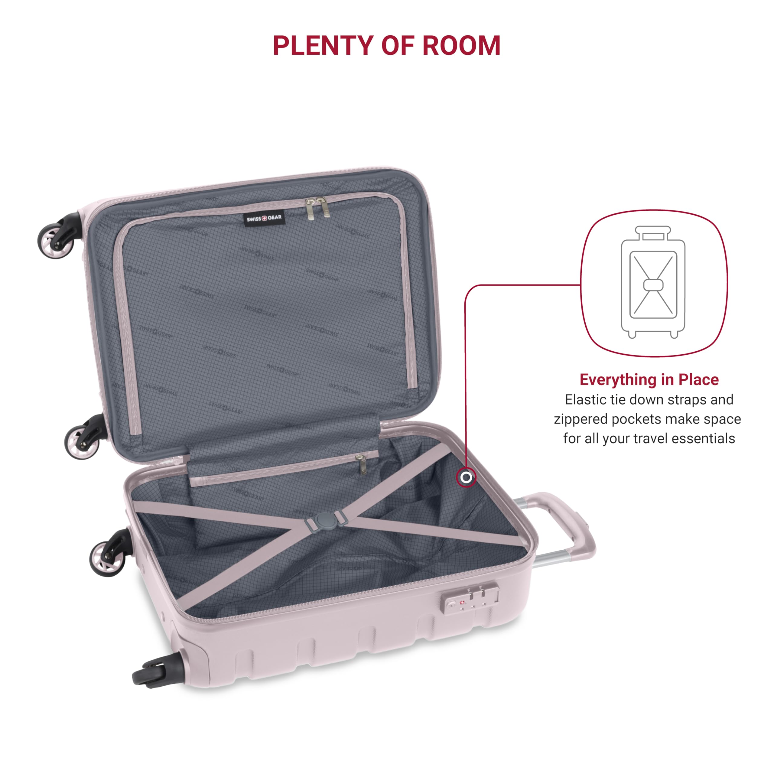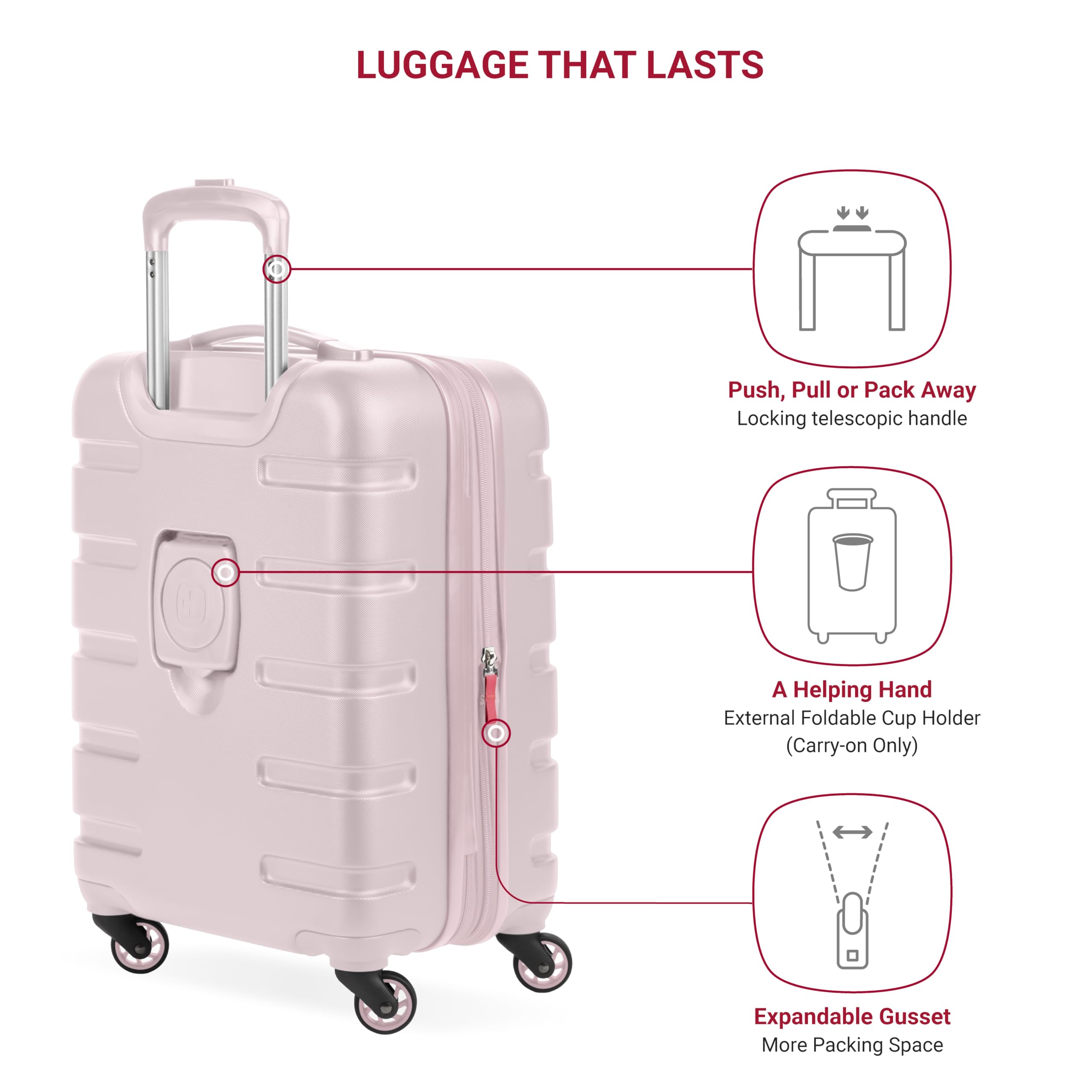 Description Experience ultimate convenience with the SwissGear 7366 Hardside Expandable Carry-On with Cup Holder. Designed for frequent travelers, this 19-inch carry-on is made from durable ABS to withstand the wear and tear of travel. It features a split-case expandable design to maximize packing space while keeping belongings organized with multiple internal pockets. Equipped with eight 360-degree multi-directional spinner wheels and a push-button steel locking telescopic handle, this suitcase glides effortlessly through crowded airports. A unique built-in cup holder adds an extra level of convenience, allowing you to keep your beverage within reach while on the move. With outside dimensions of 22" x 14.25" x 10" and 19" x 14" x 10" of packing space, this compact yet spacious carry-on is ideal for short trips. Plus, it includes a 10-year warranty for peace of mind.