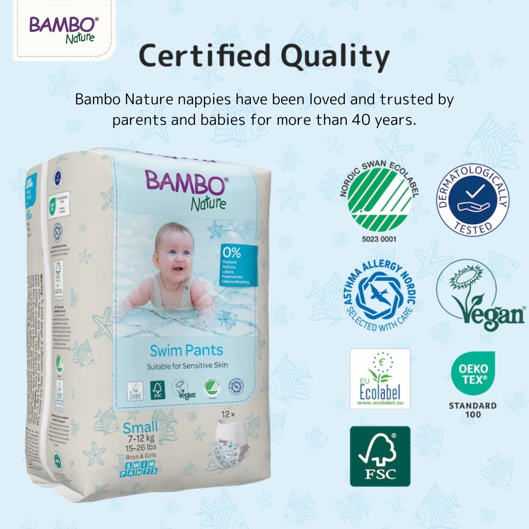 Bambo Nature disposable Swim Pants have a soft, elastic fit all-around the waist, giving your baby a super comfortable and flexible experience in the water. Designed for use in water with double leak barriers to keep the water clean and safe from messy accidents. The Swim Pants are dermatologically tested and certified according to the Nordic Swan Ecolabel, the EU Ecolabel, Asthma Allergy Nordic, the FSC™ (Forest Stewardship Council) and OEKO-TEX Standard 100.