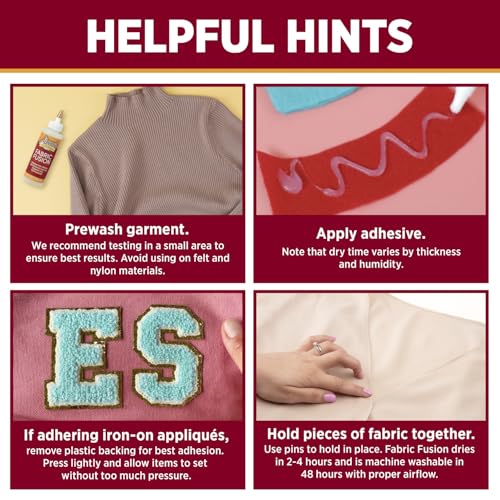 Helpful Hints: Dries in 2–4 hours (dry time varies by thickness and humidity), washable after 48 hours, and not recommended for felt, patches with plastic backing, and some nylon materials.