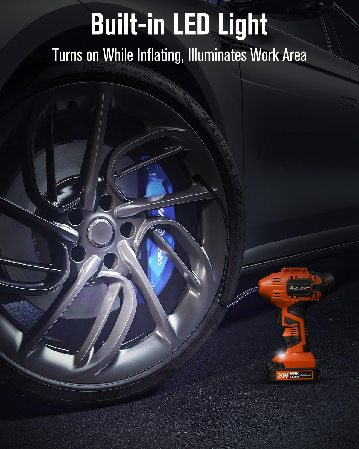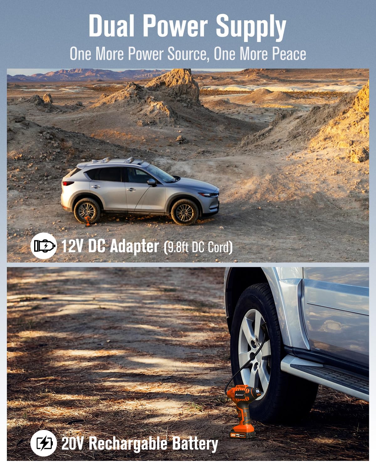 [Dual Power Supply for Maximum Flexibility] Powered by a 20V rechargeable Li-ion battery or a 12V DC adapter (with a 9.8ft cord), this portable tire inflator for car gives you options. Never stress about a dead battery on the road—just plug it into your car’s 12V outlet for uninterrupted use. Perfect for roadside emergencies
