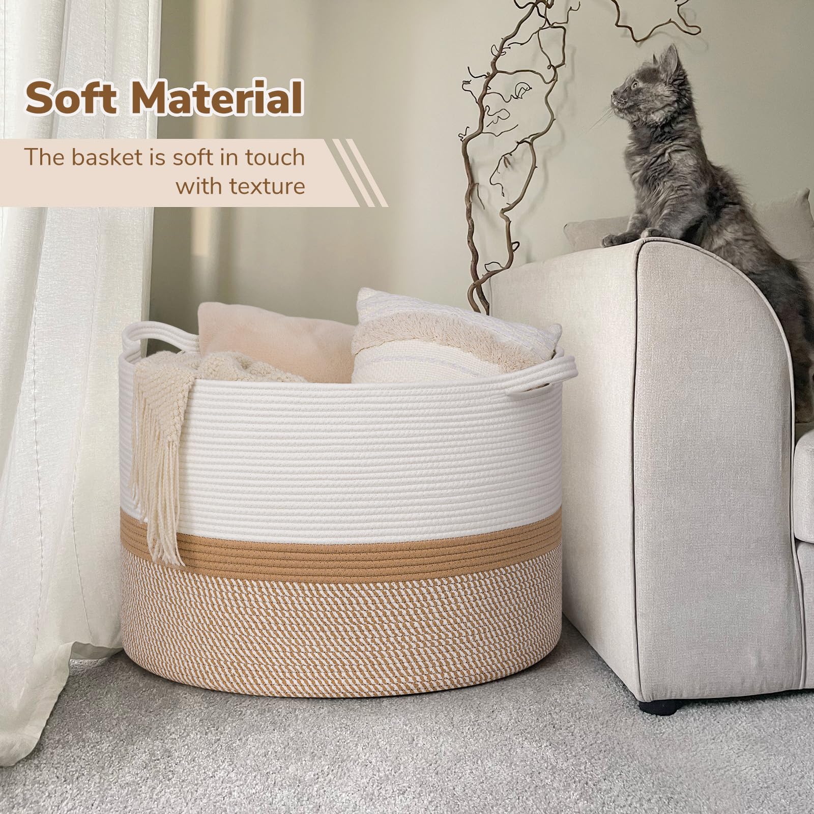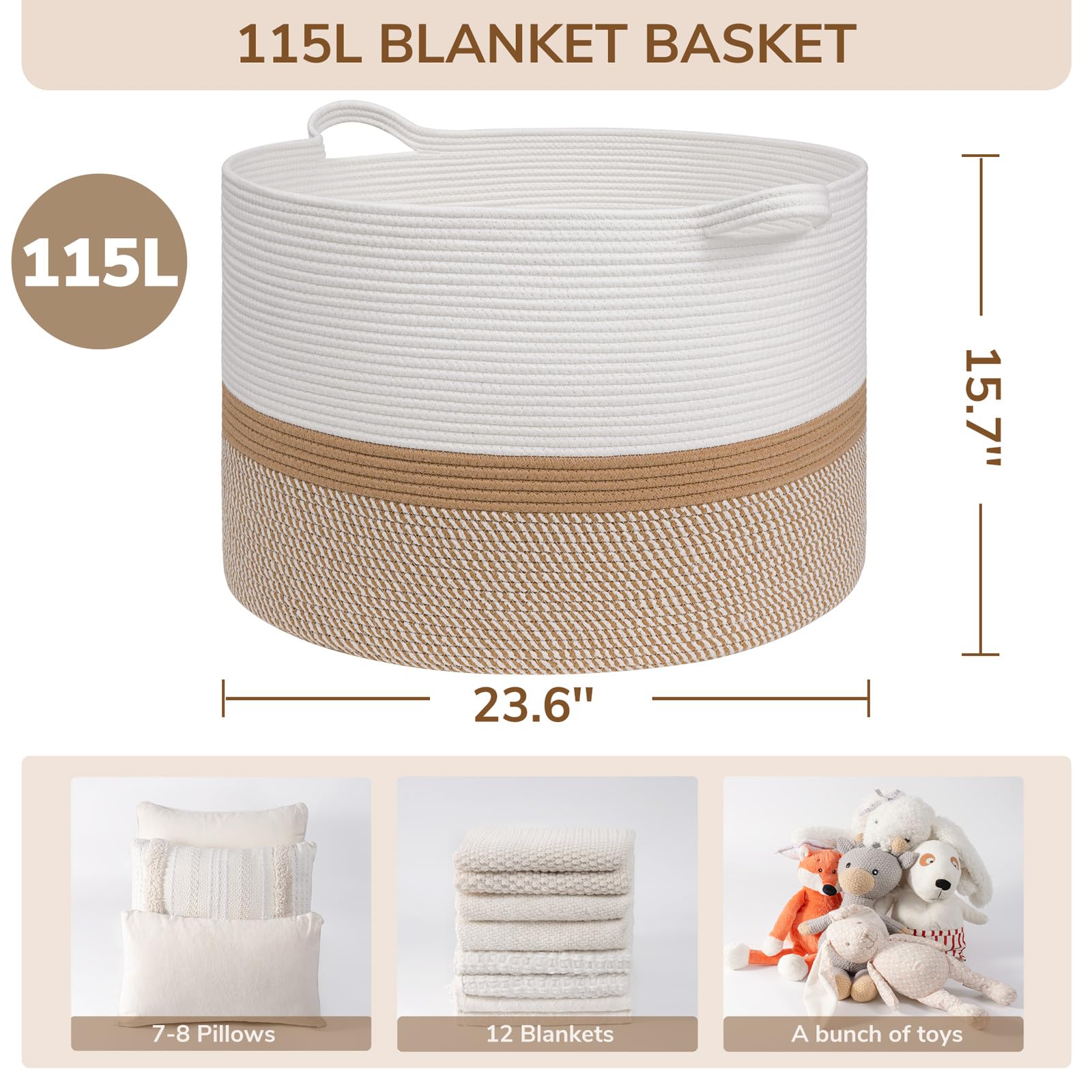 Spacious Jumbo Design. This 115L large wicker basket(23.6"D x 15.7"H) provides 30% more space than our 90L model, perfect for larger families or more extensive organizing needs. It easily holds extra blankets, clothes, and toys, keeping your home tidy and stylish.