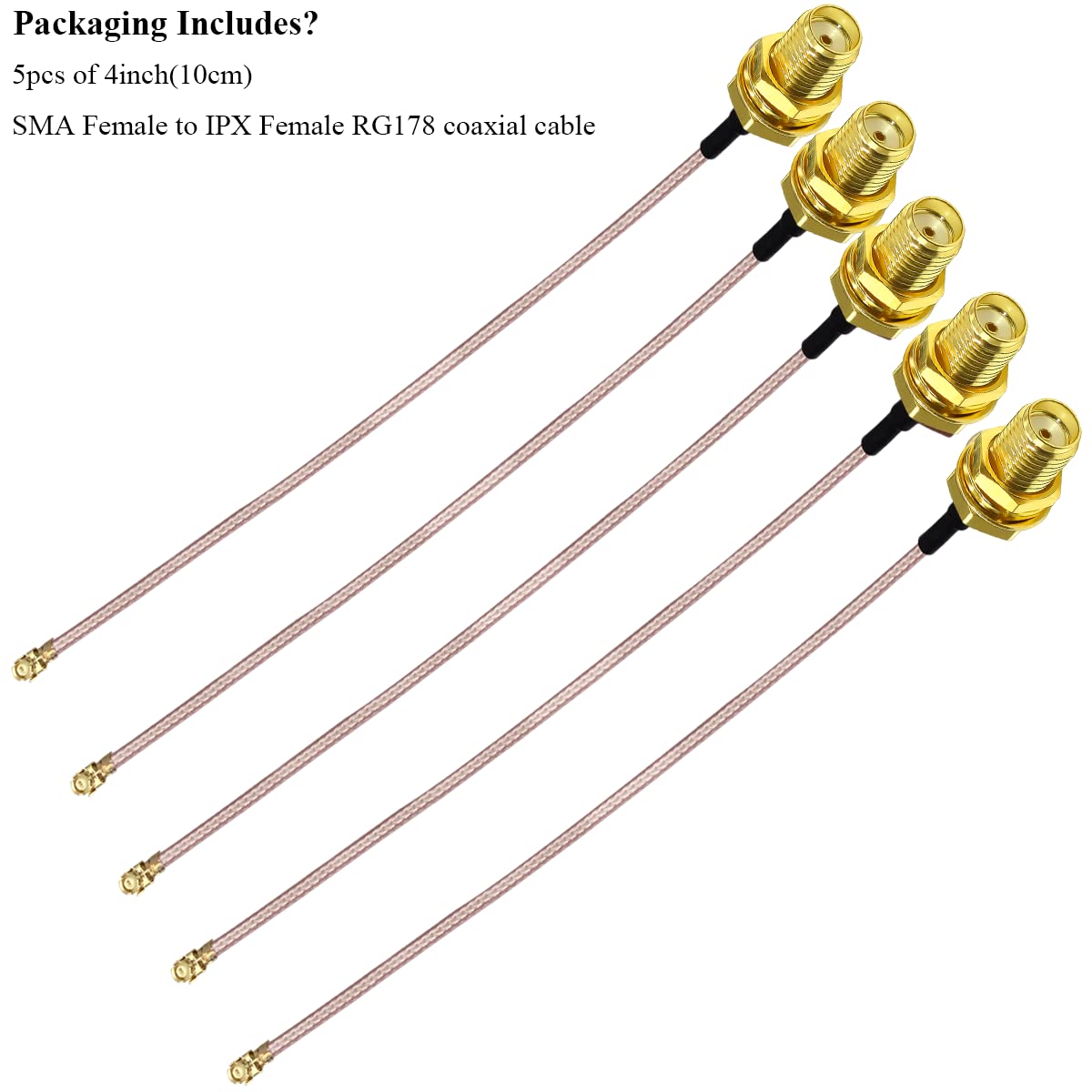 Package Included: 5pcs SMA Female to IPX coaxial cable (Connector 1: SMA Female connector, Connector 2: IPX connector, Cable type: RG178 coax cable)