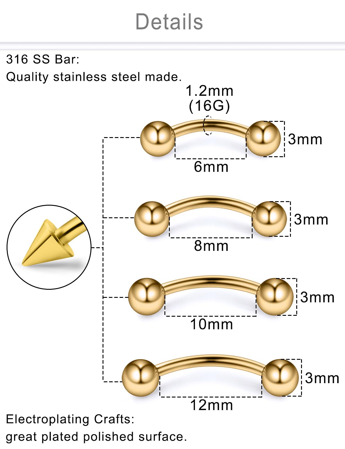 MEASUREMENTS: Gauge: 16G (1.2mm); Wearable Bar Length: 6mm(1/4"), 8mm(5/16"), 10mm(3/8'), 12mm(1/2"); Ball Size: 3mm; Spike Size: 3mm. Incellent Externall Threaded, Firmly Screw on and Flexibly Screw off. Color: Gold-tone.