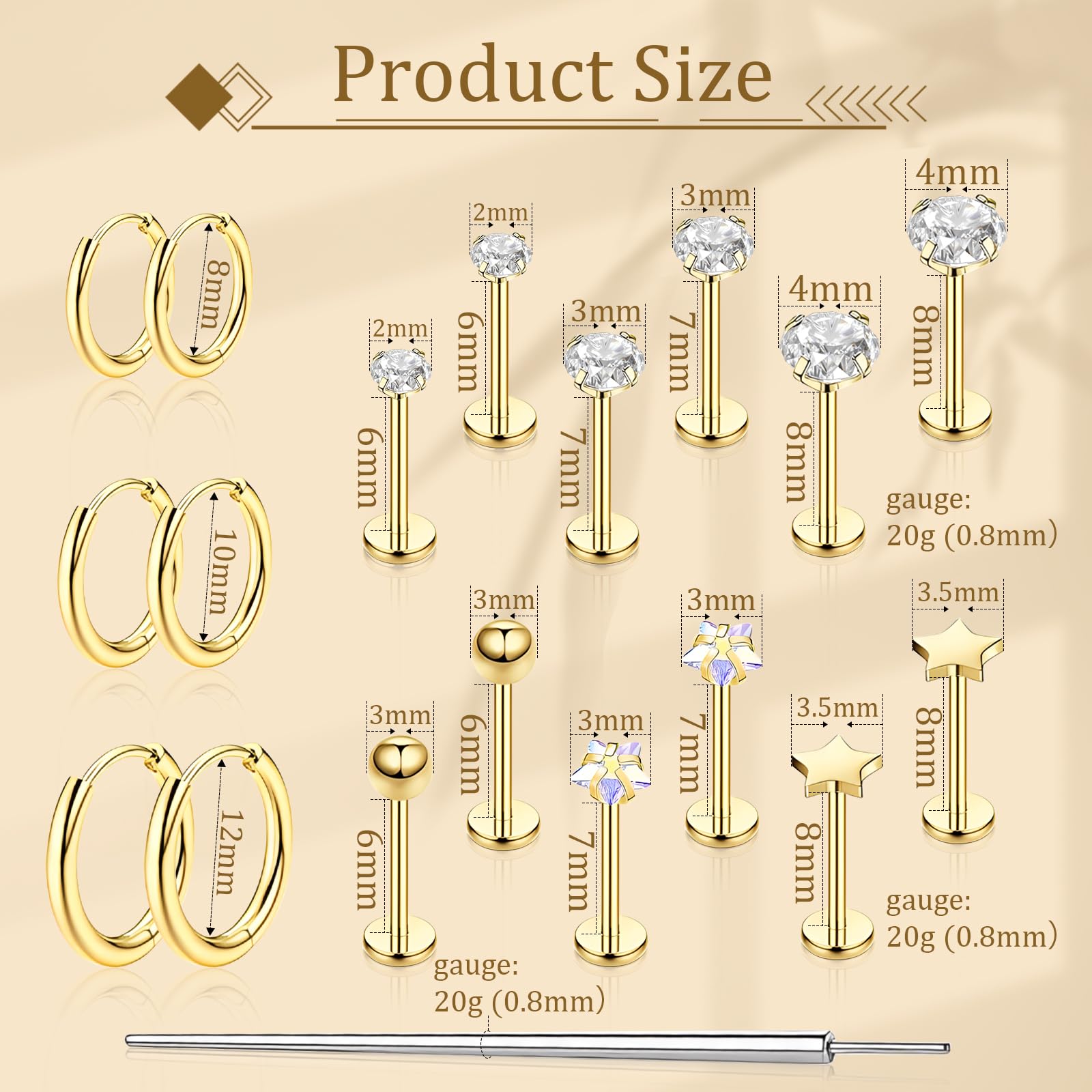 Cartilage Earrings for Women: Small Hoops:8mm (0.32in), Medium Hoops: 10mm (0.39in), Big Hoops:12mm(0.47in). Hypoallergenic gold hoop cartilage earrings kit easy to put on and take off.Perfect choice for people who have many ear piercings.