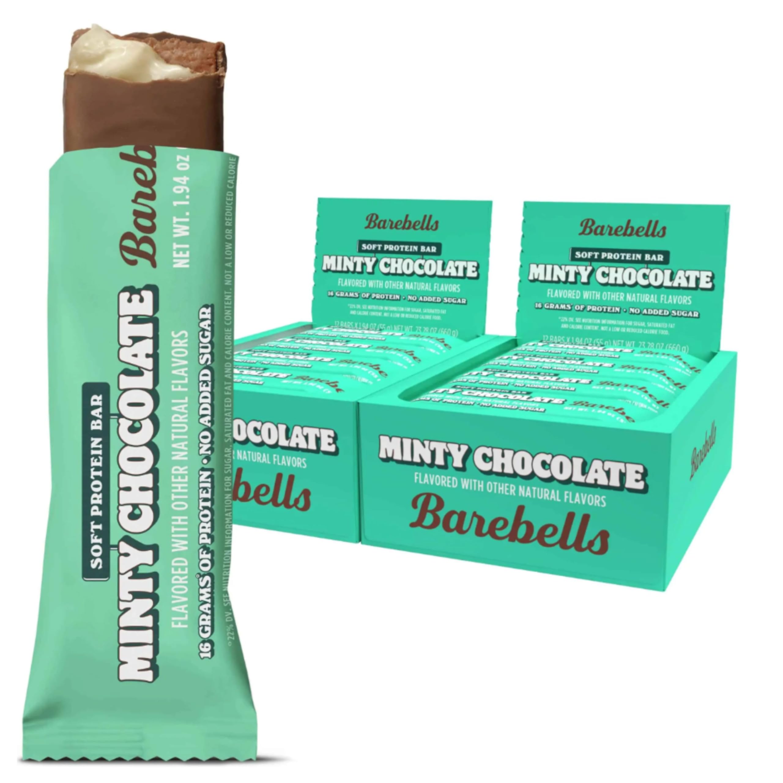 "BAREBELLS SOFT PROTEIN BARS MINTY CHOCOLATE - 24 individually wrapped bars! Soft milky chocolates coats a cool mint center to deliver you deliciousness in every bite of of our Minty Chocolate Soft Bar. "