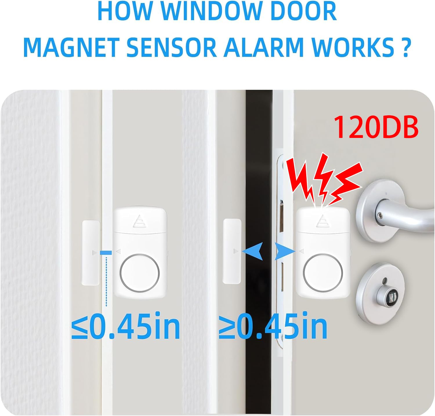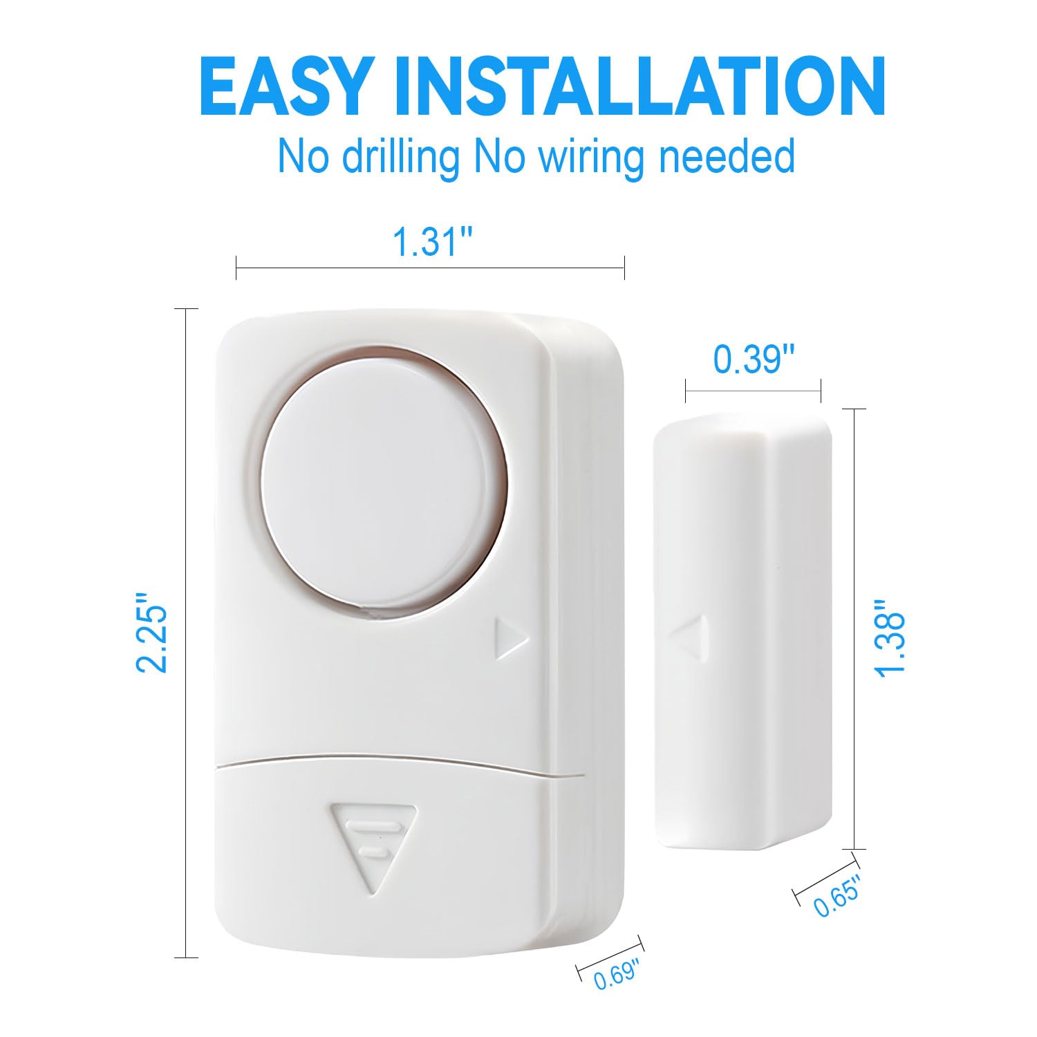 【New Design】Once the alarm and magnet are separated more than 0.4 inches, the alarm siren keeps going until you close the door. Window alarm sensors are powered by LR44 batteries (included)