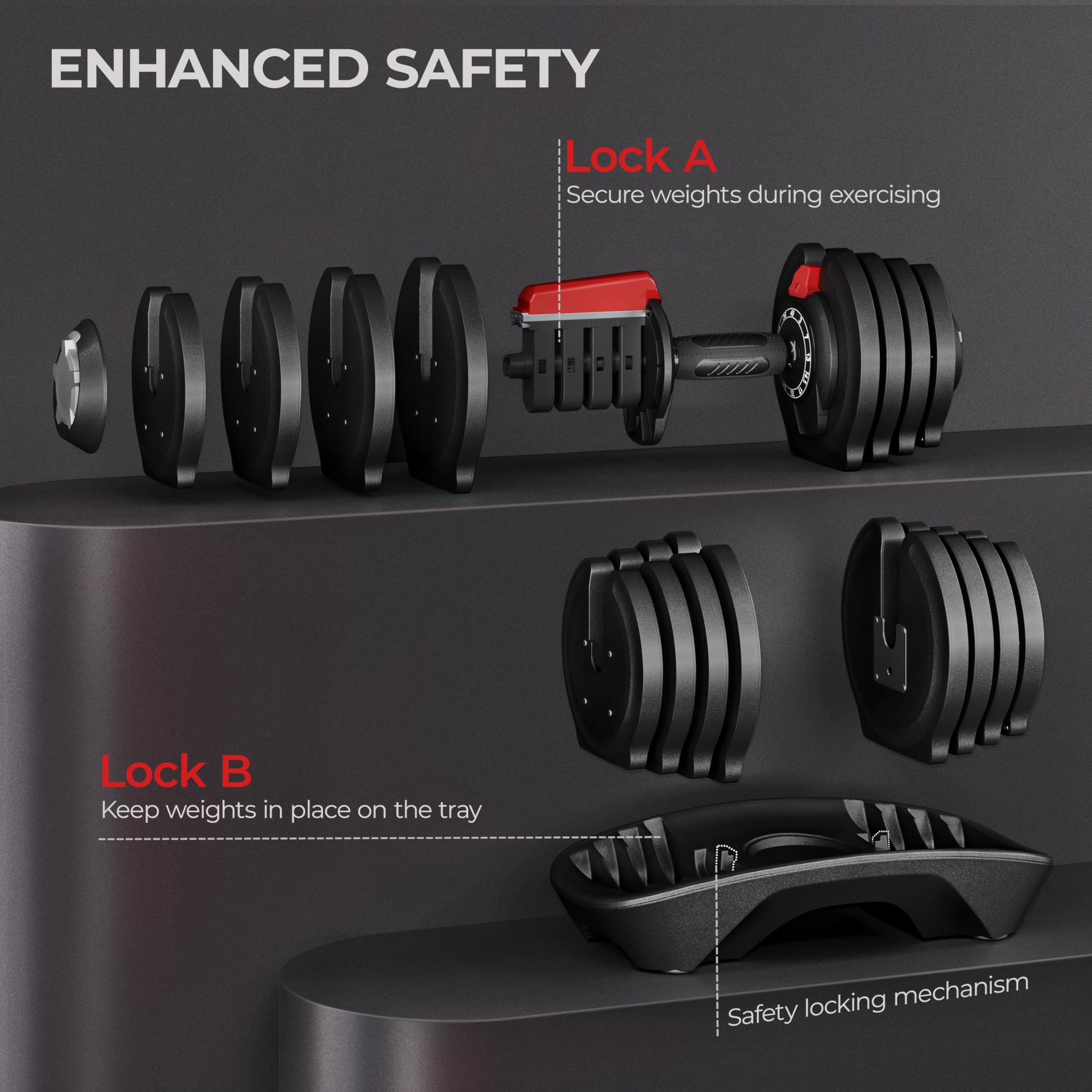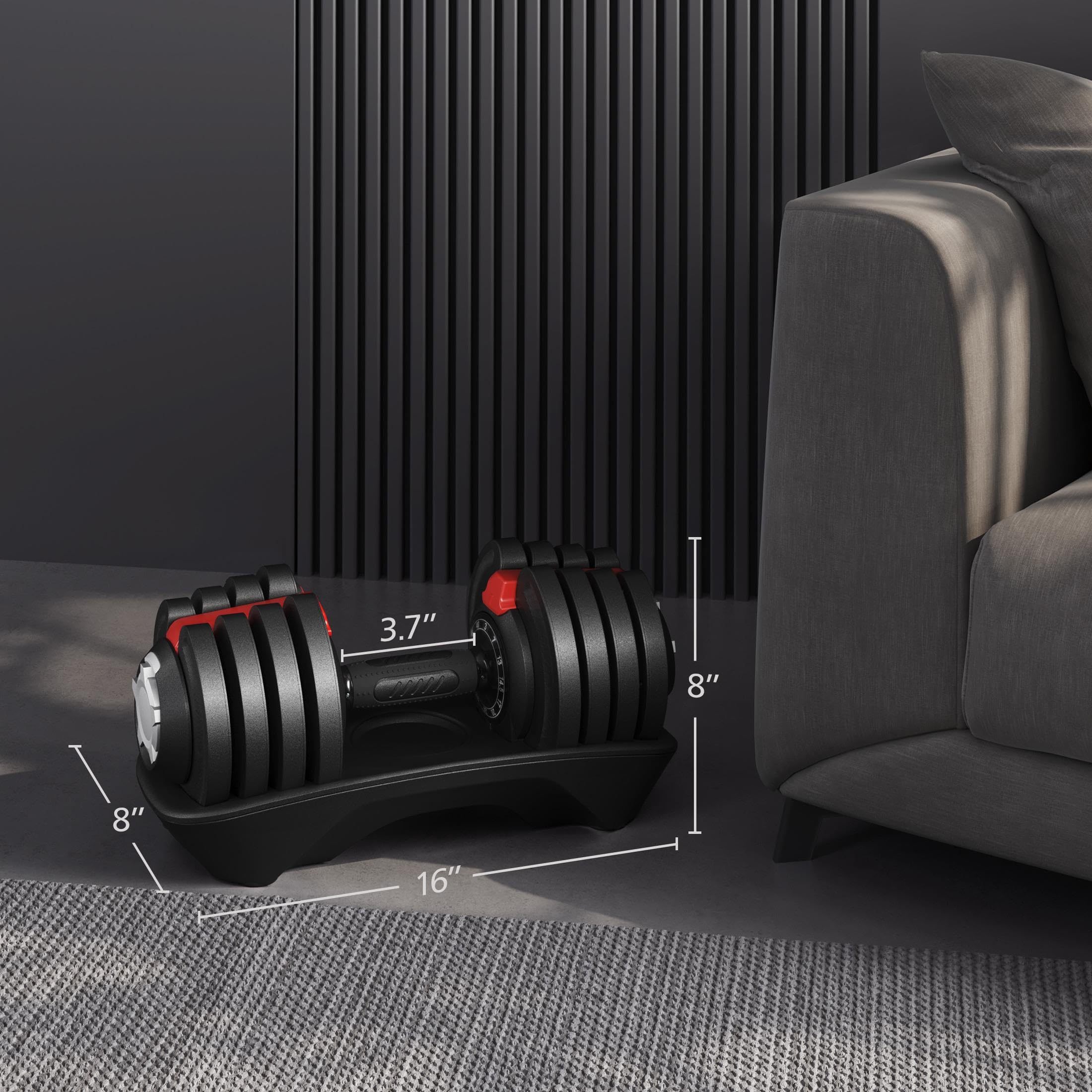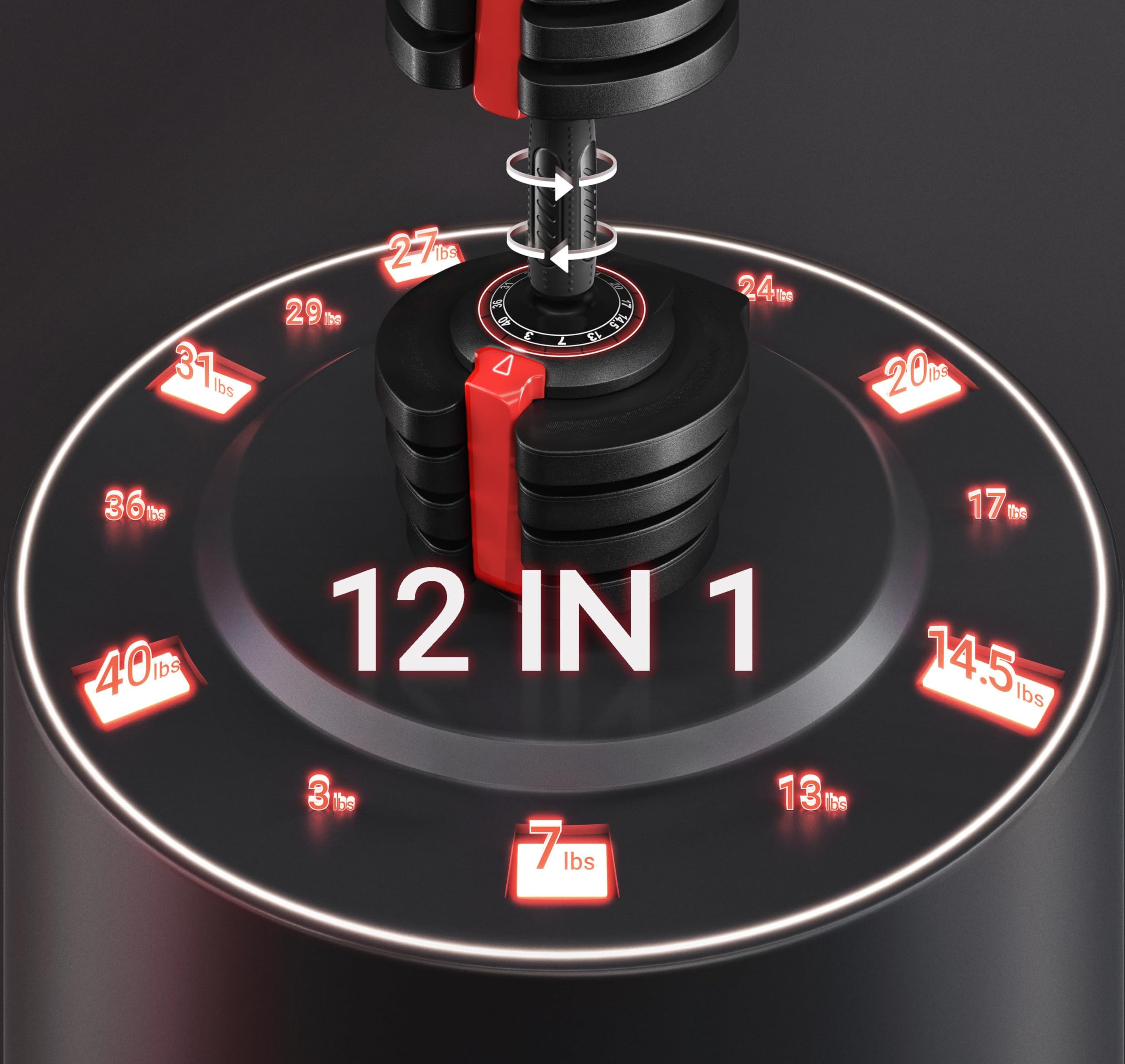 12-IN-1 ADJUSTABLE DUMBBELLS:This dumbbell set spans a wide weight range from 4 lb to 40 lb in diverse and smaller increments to facilitate gradual resistance, intensity, or volume adjustments.