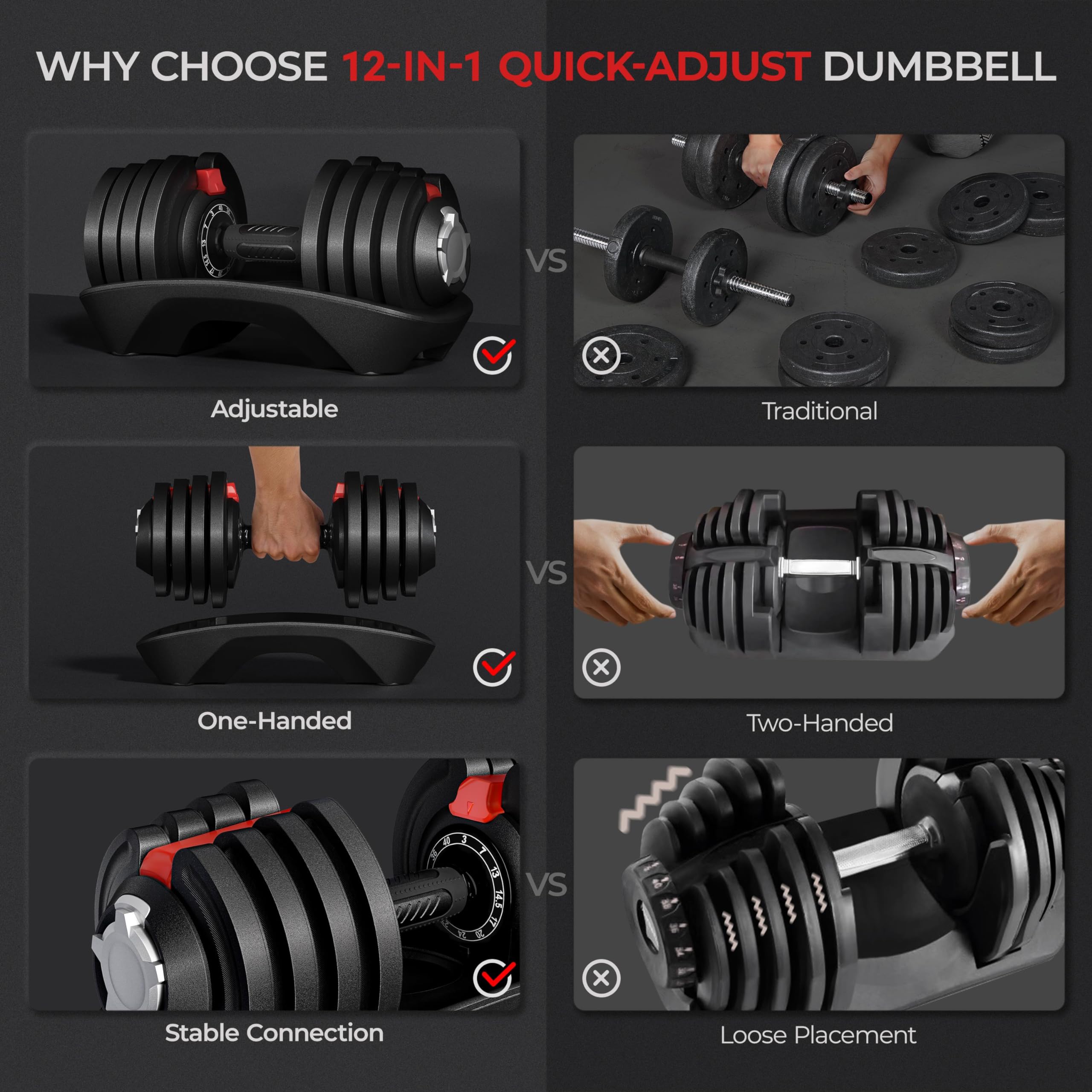 1-SED ADJUSTMENT FEATURE:With just a quick grip, twist, and lift of the selectorized anti-slip handle, you can easily switch the 12 adjustable weight dumbbells settings in just one second. The hassle-free customization is aided by clear dials that ensure easy readability