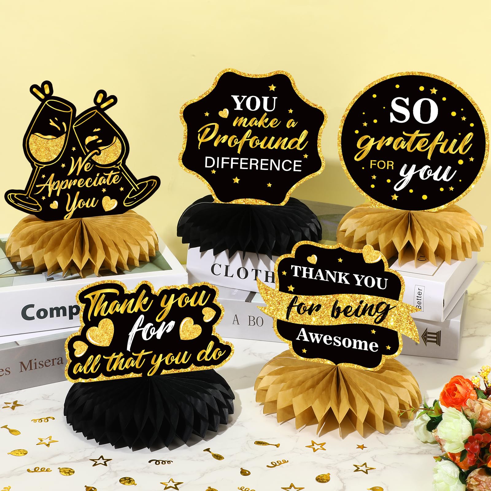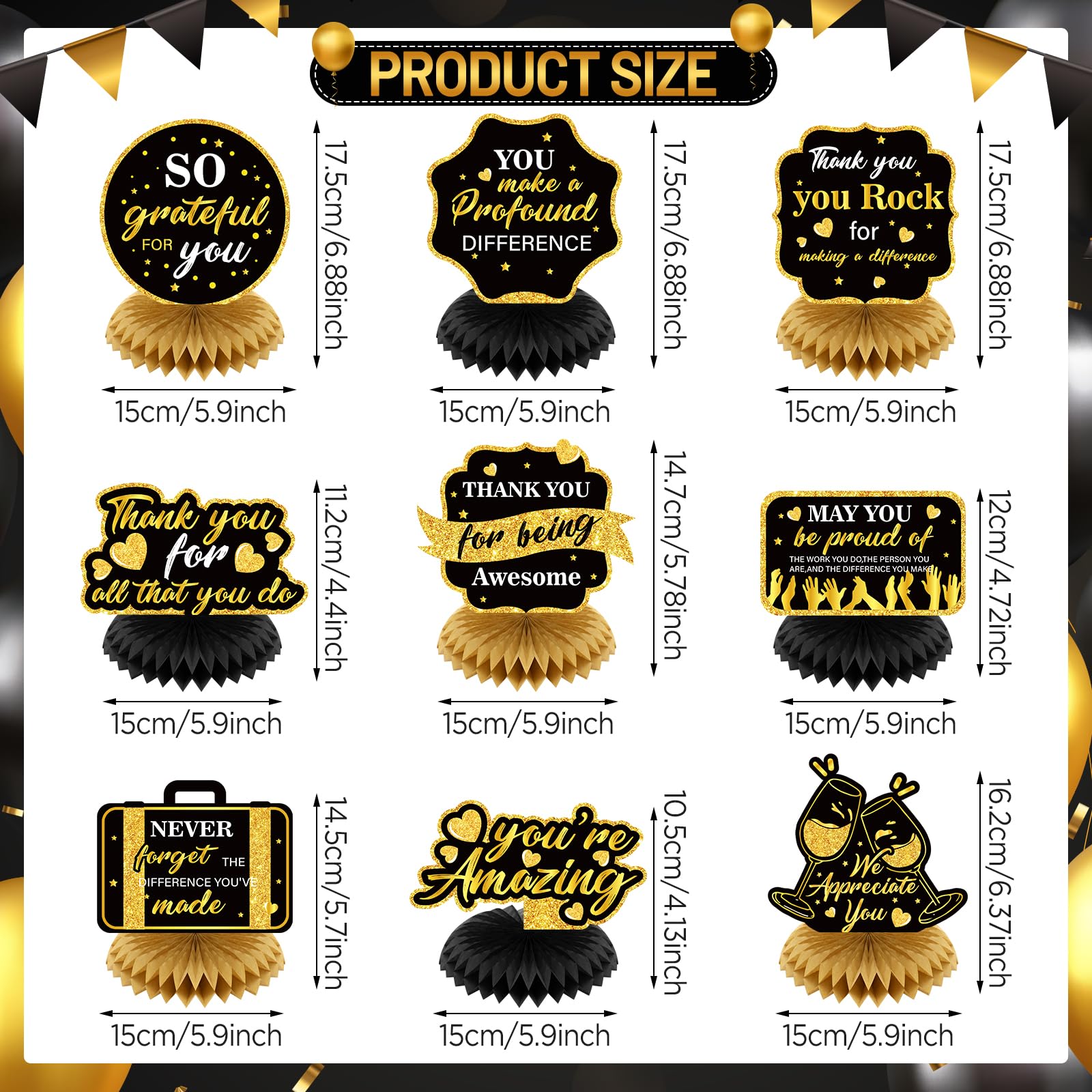 What You Will Get: This package include 9 pieces of black gold we appreciate you honeycomb centerpieces in 9 different designs, combine black gold with thank You themed elements, It is great ideal for your different kinds of appreciation, office celebrations, retirement and graduation parties