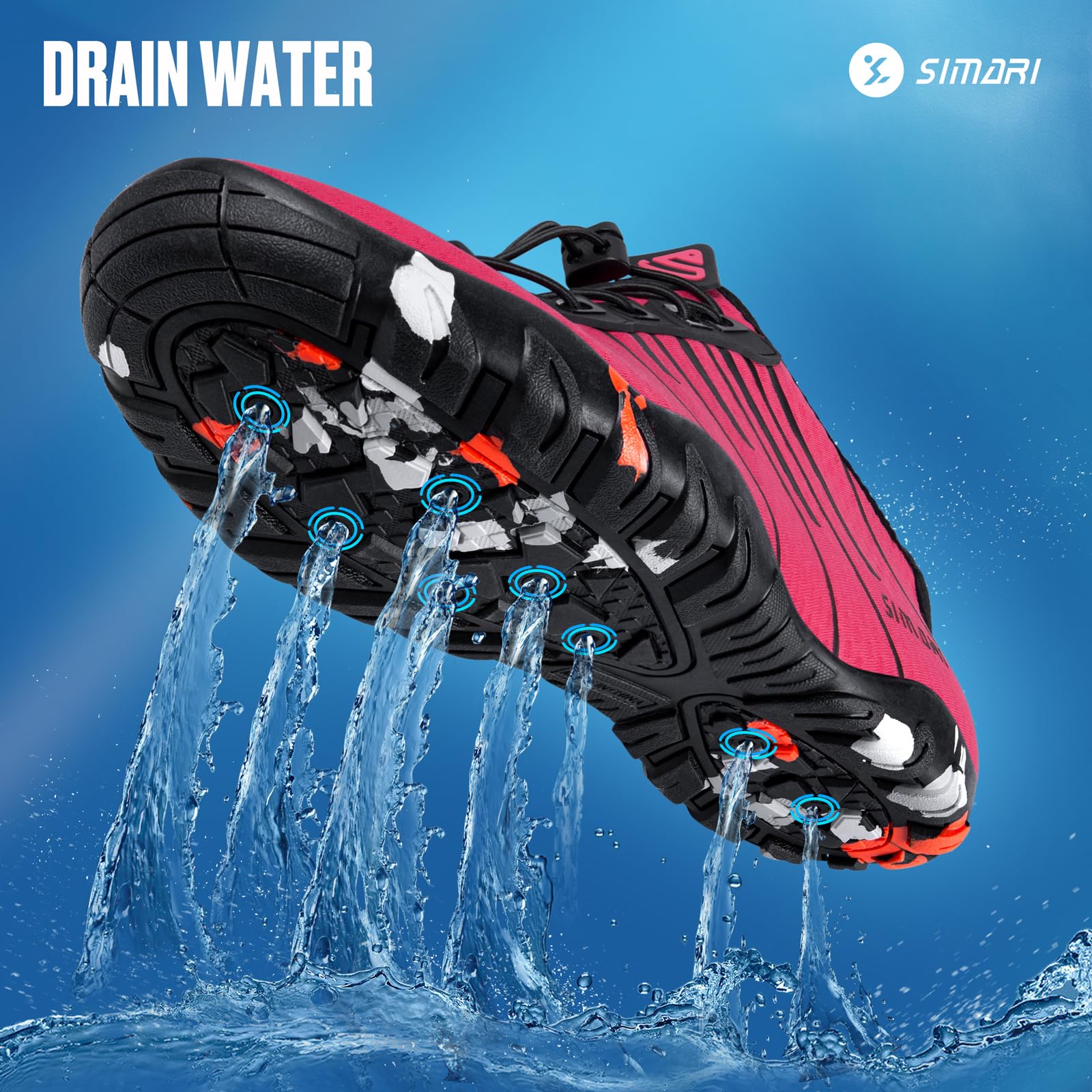 Quick-Dry Swim Shoes with Drainage Holes: 360° Drainage System, Water drains instantly through soles and insoles. The air-mesh fabric dries faster than regular pool shoes—perfect for diving, wakeboarding, canyoneering, cruise travel and water aerobics.