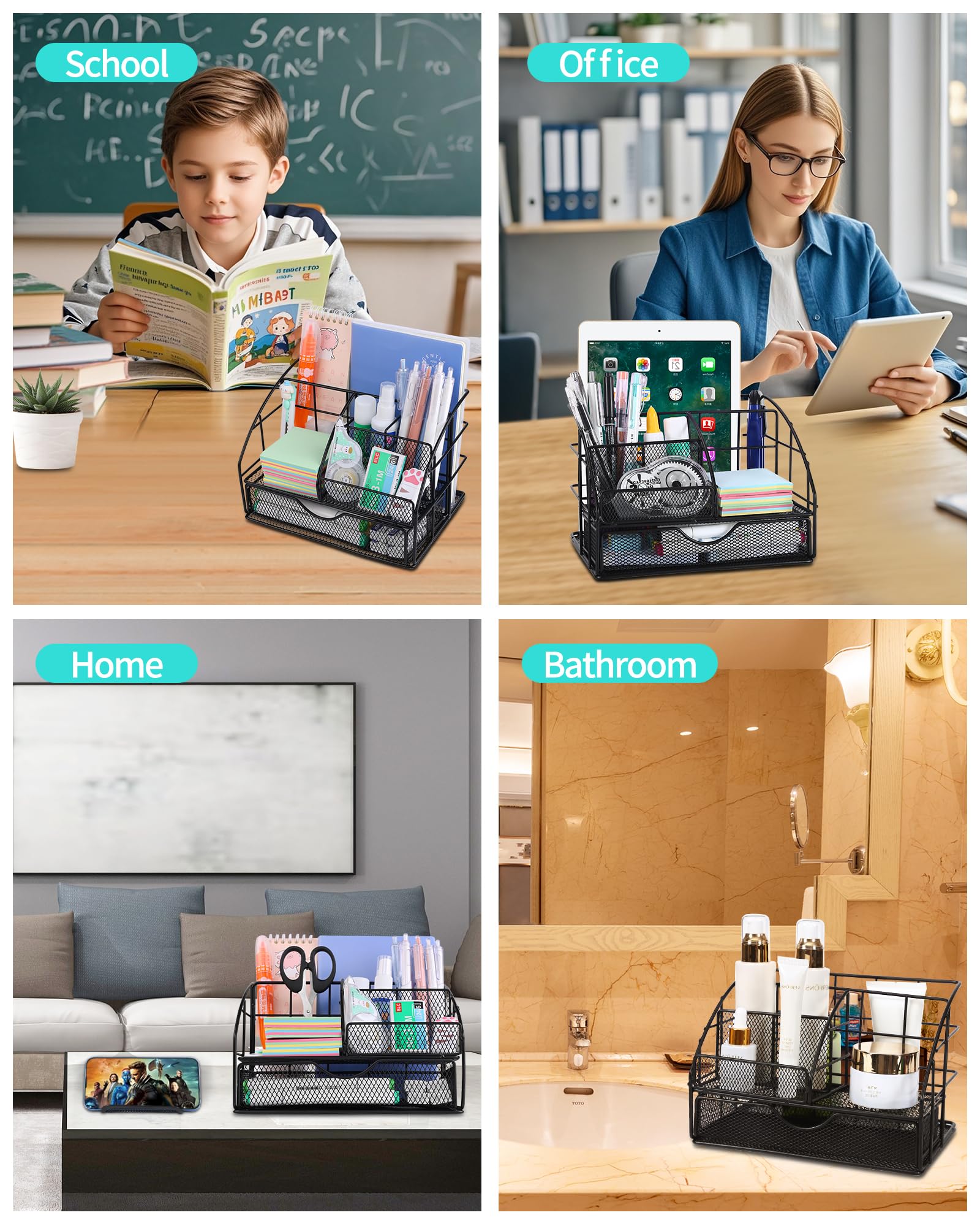 Durable and Spacious Metal Desk Organizer: The metal desk organizer is crafted with sturdy materials to ensure durability and long-lasting use. Its compact dimensions of 8.9 x 5.9 x 5.9 ins make it an ideal fit for any desktop without consuming excessive space. Designed with multiple compartments, it provides ample storage for various office essentials, including pens, pencils, and small office supplies. Blending seamlessly with professional or home office setups while maintaining functionality