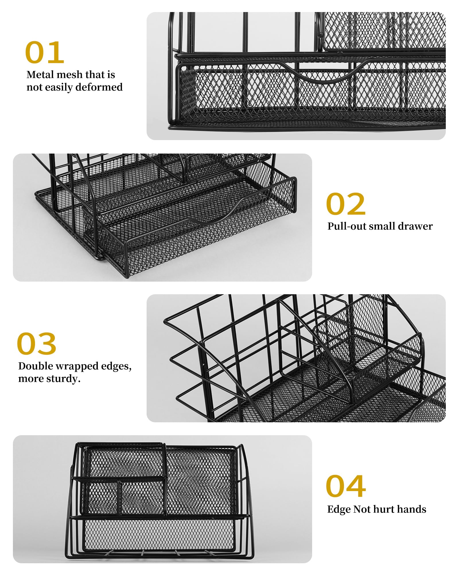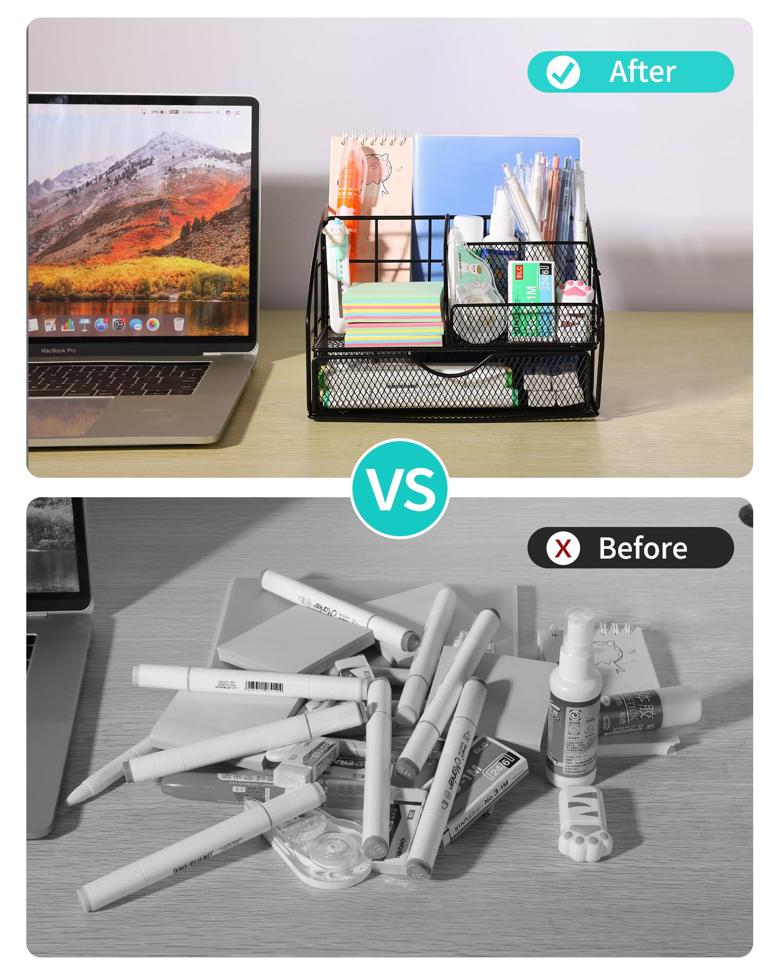 Efficient Storage with Functional Design: The metal desk organizer features a practical mesh design that prevents dust accumulation while allowing clear visibility of contents. Its non-slip pads ensure stability on surfaces, while the compact size keeps supplies organized without overpowering your workspace. This user-friendly setup is ideal for sorting daily office supplies, crafting tools, or student essentials. The included stapler and binder clips enhance document organization