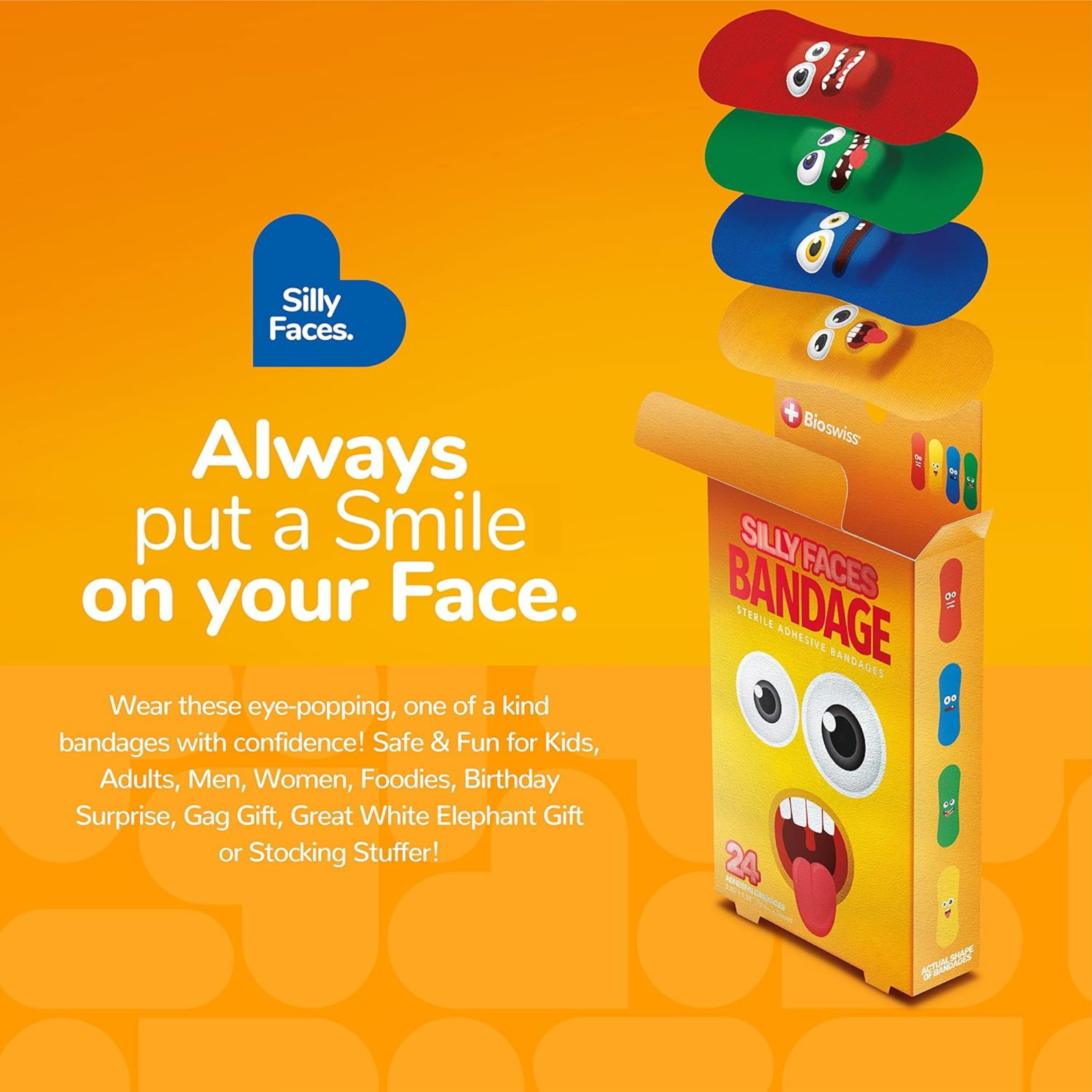 24 SILLY FACE BANDAGES: Silly face-shaped adhesive bandages pack helps protect cuts, scrapes, and minor wounds while making healing less stressful; bandages come in 4 assorted styles