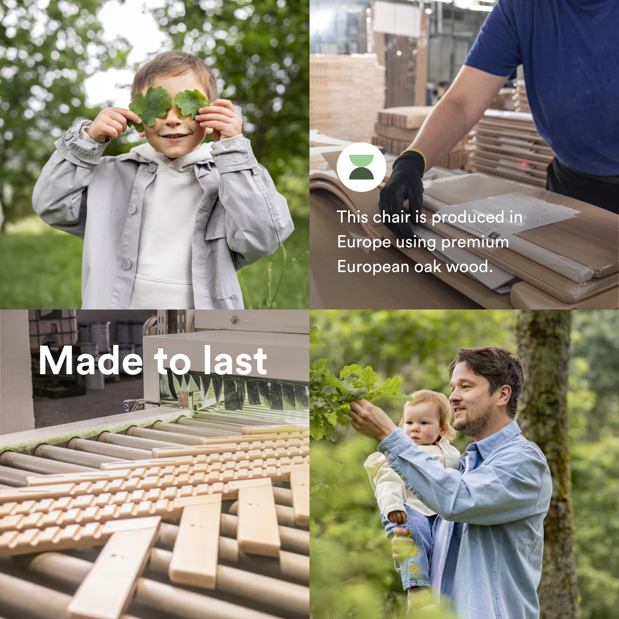 STURDY & SAFE - This solid, oak wood chair can hold up to 300 lbs. Plus, the High Chair comes with gliders for additional stability.