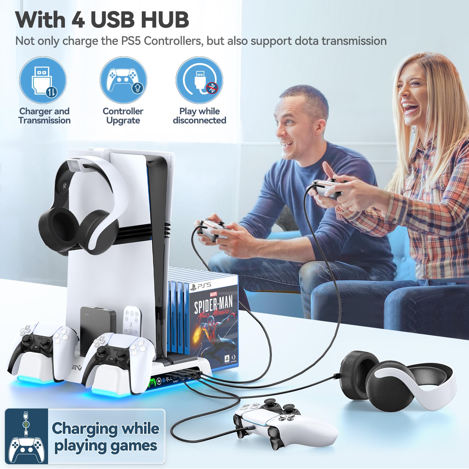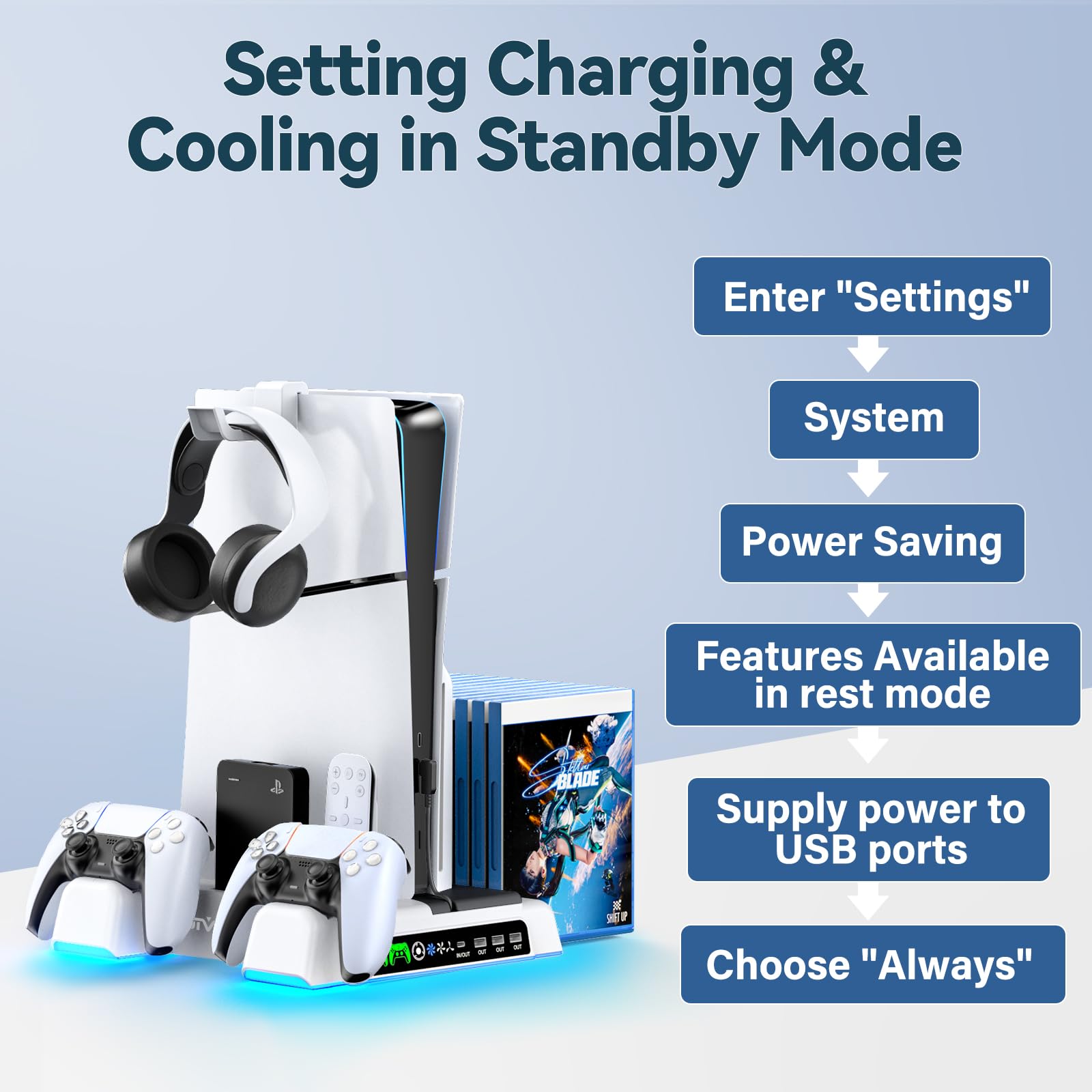 Easy to use & Excellent Space Management: The PS5 charging dock with efficient cooling fans and dual PS5 charger, ps5 slim cooling fan.Hold 14 games disc, headset,screw storage, slim/pro adaper, media remote, hard drive external, cooling system all-in-one
